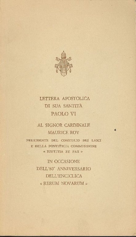 In occasione dell'80° anniversario dell'enciclica ''Rerum novarum'' . 8vo. pp. 76. . Molto buono (Very Good). Sottolineature a matita e matita colorata (Some underlined passages in coloured pencil). . .