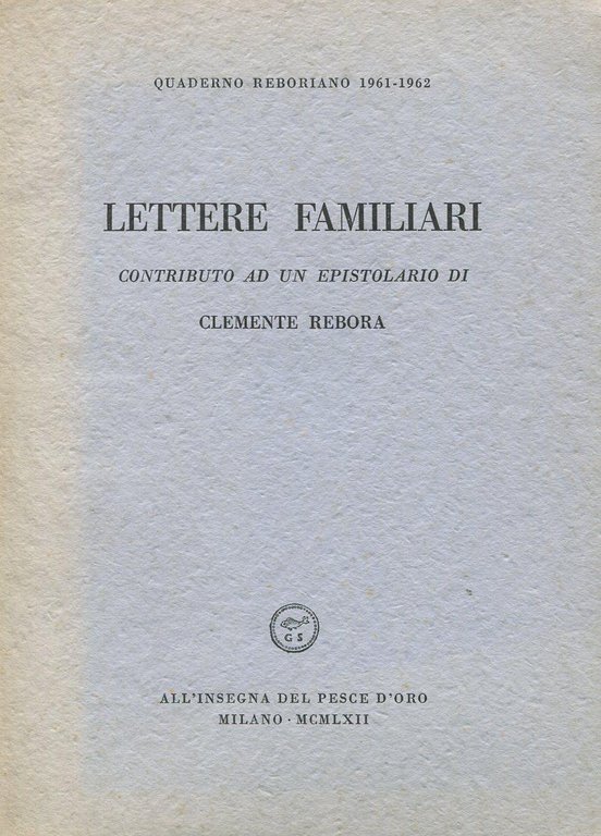 Quaderno reboriano 1961-1962. Lettere al fratello. Lettere alla madre Volume n. 2 della collana "Quaderni reboriani". Collana a cura degli Amici di don Clemente Rebora. Quaderno a cura di Vanni Scheiwiller, stampato a Milano dalla Tipografia U. Allegretti di Campi il giorno di Ognissanti 1962. Copia n. 72. 8vo. pp. 76. . Molto buono (Very Good). . Prima edizione di Cl + 500 es. numerati. Scheiwiller [Novati, 2013] NOVATI, Laura. Giovanni e Vanni Scheiwiller editori. Edizioni Unicopli, 2013.