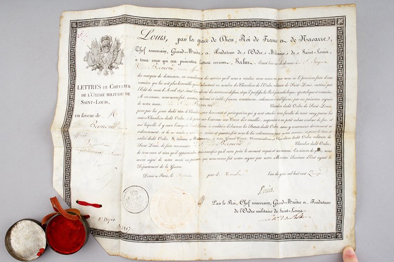 1 diplôme pré-imprimé sur vélin (31,5 x 39 cm), complété à l'encre avec sceau de cire sous son étui de métal. Rappel du titre complet : Lettres de Chevalier de l'Ordre Militaire de Saint-Louis, en faveur de M. Jacques Bermond, ancien officier. Donné à Paris le huitième jour de Novembre l'An de Grâce 1815 [ Signé "Louis", par le Garde des Sceaux Etienne Pasquier et le Maréchal Duc de Feltre, avec le sceau de cire conservé dans son étui ] Beau document signé par Louis XVIII, Etienne Pasquier et le Maréchal Clarke. Duc de Feltre, Clarke était alors Maréchal de France et nouveau Ministre de la Guerre de Louis XVIII. La signature du Garde des Sceaux est celle d'Etienne Pasquier. Quant à Jacques Bermond (1768-1851), cet ancien officier et négociant en bois était un chef royaliste montpelliérain. Lors de la cérémonie de remise de l'ordre, le candidat devait jurait de vivre et mourir dans la religion catholique et de rester fidèle au roi, de défendre ses droits et ceux de la Couronne, conformément à l'éthique chevaleresque médiévale et "de se comporter en tout comme bon, sage, vertueux et vaillant chevalier". Intéressant exemplaire, décerné en novembre 1815 dans les premiers temps de la Seconde Restauration (Pasquier est ministre de la justice jusqu'en septembre), et bien complet de son sceau (petit trou au diplôme et pliures, éclat de cire sans manque dans le sceau).