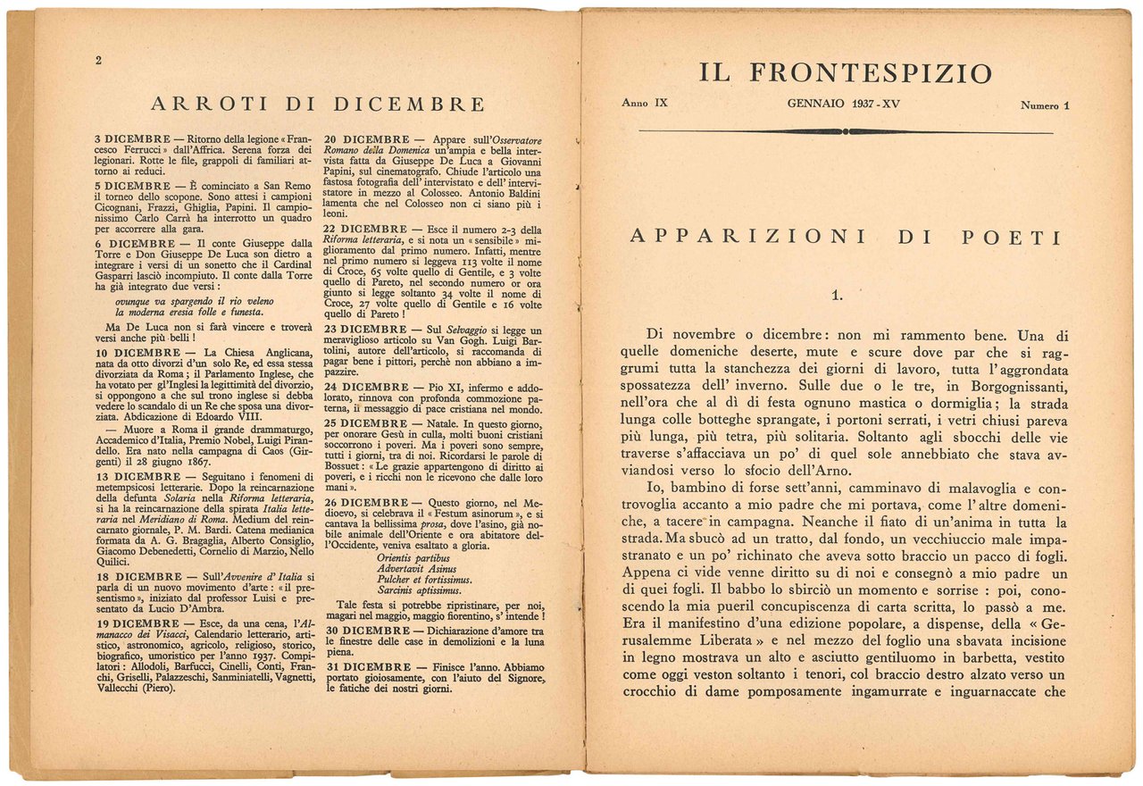 - Annata 1938-XVI. Numeri 1-5 e 9-12 (mm 272x195): numerazione continua dei diversi fascicoli, con illustrazioni in bianco e nero nel testo e fuori testo. Le ultime pagine di ogni fascicolo, stampate su carta rosa, contengono le pubblicazioni della casa editrice Vallecchi. Carta uniformemente brunita. Brossura editoriale con lievi fioriture e minime mancanze marginali e al dorso.
