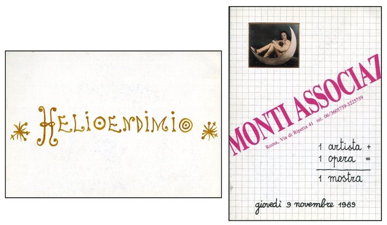 Cartoncino d'invito all'inaugurazione della mostra Helioendimio di Luigi Ontani, giovedì 9 novembre 1989, presso Monti associazione culturale, via di Ripetta, Roma. La mostra si collocava nell'ambito della celebre iniziativa di Pio Monti 1 artista + 1 opera = 1 mostra che prevedeva mostre personali focalizzate su un'unica opera o installazione dell'artista scelto . Cm 15x10. . . Ottimo (Fine). . . . La carriera artistica di Luigi Ontani si è avviata nella seconda metà degli anni sessanta con le sue prime performances (Tableaux vivants), nelle quali si presenta mascherato in vari modi: da Pinocchio a Dante, San Sebastiano, Bacco. A partire dagli anni settanta inizierà ad affermarsi come uno dei principali esponenti italiani della Body Art e della Performing art. La sua tecnica artistica si basa sia sui Tableaux vivants, in cui l'artista si mostra in pose statiche dal vivo, che sui D'après, nei quali riproduce i dipinti di Caravaggio, Guido Reni, Tintoretto, etc. Queste sue esibizioni vengono fotografate e stampate a colori in grandi formati.Fra le principali mostre personali si ricordano: Fondazione De Appel, Amsterdam, 1975; Sonnabend Gallery, 1977: Galleria L'Attico, 1978; 121 art gallery, Anvers, 1983; Groninger Museum, 1986; Frankfurter Kunstverein, Frankfurt, 1996; Sperone-Westwater, New York, 1997; Bangkok national gallery, 2002; Kunsthalle Wien, Vienna, 2003; The Serpentine Gallery , Londra, 2010; Castello di Rivoli, Torino, 2011; Hammer Museum, Los Angeles, 2011. Numerose le sue mostre collettive, fra cui: Biennale di Venezia 1972, 1978, 1984, 1986, 1995, 2003; Identité Italienne: Art en Italie depuis 1959 Centre Pompidou Paris 1981: Italian Art Now: An American Perspective Guggenheim Museum New York 1982; VI Sidney Biennial 1986; La otra Scultura. trenta anos de escultura italiana Centro de Arte Reina Sofia Madrid 1990; Manifesta 2008; A bigger Splash: Painting after Performance TATE Modern London 2012 Indiomania. Europalia festival Bruxelles 2013. Luigi Ontani ha pubblicato diversi libri d'artista.