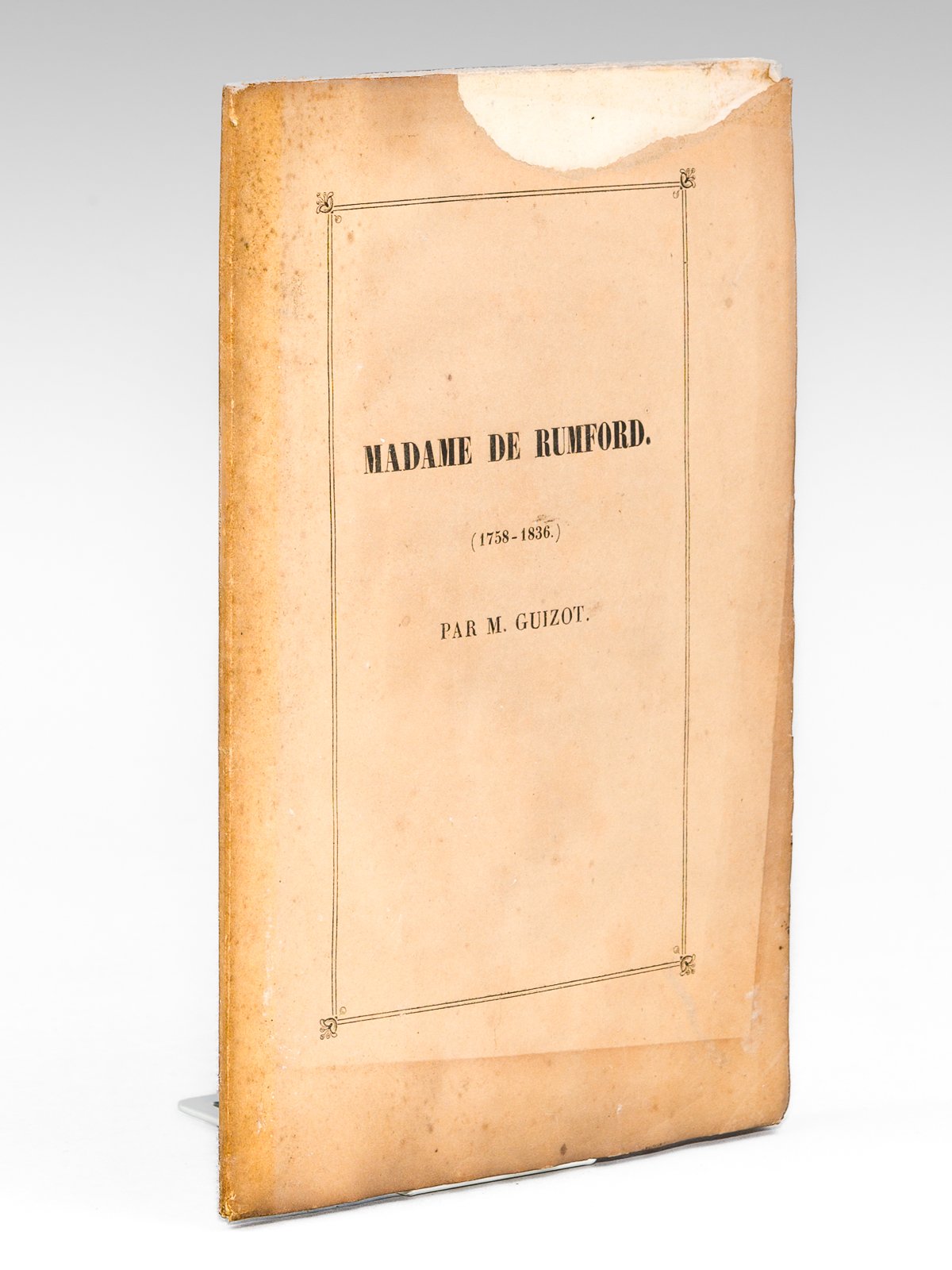 1 brochure in-8, De l'Imprimerie de Crapelet, Paris, 1841, 2 ff., 35 pp. Rare exemplaire de l'édition originale. La Comtesse de Rumford n'était autre que Marie-Anne Paulze, épouse du chimiste Antoine Lavoisier. Collaboratrice de son époux, elle illustrera elle-même le "Traité élémentaire de chimie" de Lavoisier. Guizot l'écrit : "Elle vivait dans le laboratoire de M. Lavoisier, l'aidait dans ses expériences, écrivait ses observations sous sa dictée, traduisait, dessinait pour lui. Elle apprit à graver, pour qu'il fût sûr d'un ouvrier exact jusu'au scrupule, et les planches du "Traité de Chimie" furent bien réellement l'oeuvre de ses mains". Etat très satisfaisant (mq. en couv., couv. un peu frottée, bon état par ailleurs).