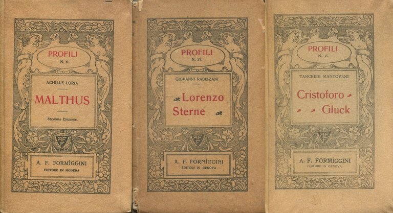 . 16mo. pp. 80. . Molto buono (Very Good). Pagine chiuse (Uncut pages). Seconda edizione (2nd Edition). . Si aggiungono due libri dell'editore Formiggini, collana Profili: Tancredi MANTOVANI, Cristoforo Gluck (1914) - Giovanni RABIZZANI, Lorenzo Sterne (1914. Dorso con piccola mancanza ). Buono stato