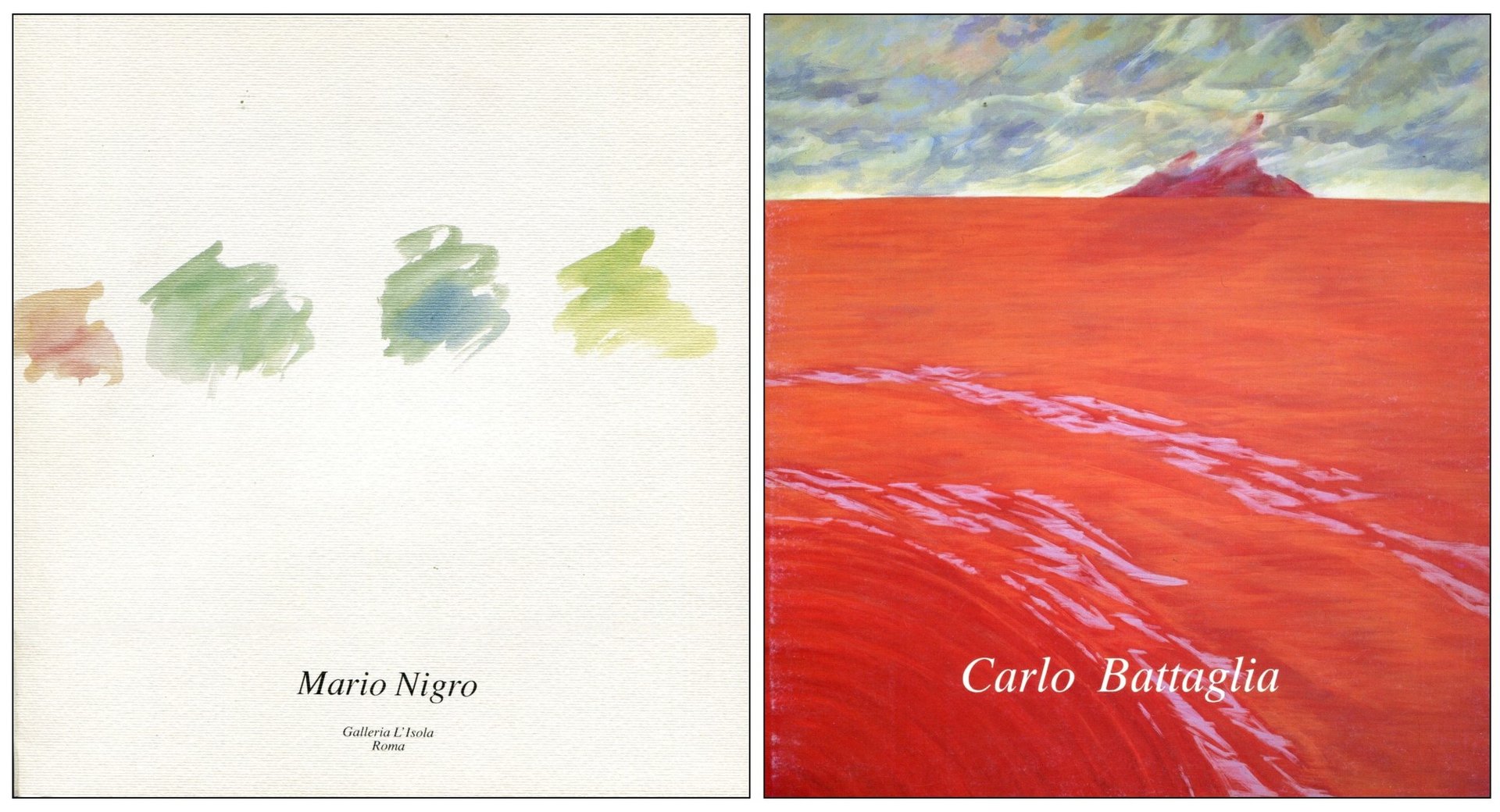 Catalogo di mostra alla Galleria L'Isola, Roma, maggio-giugno 1990. Presentazione di Tommaso Trini. Con 11 tavole a colori. Nota biografica, attività espositiva . 8vo. pp. 24. . Ottimo (Fine). . . . Si aggiunge il catalogo: Carlo Battaglia. Galleria L'Isola 1991 (Catalogo della Mostra alla Galleria L'Isola, Roma, marzo-aprile 1991. Con scritti di Carlo Battaglia, Gian Piero Vincenzo e Federico Zeri. 11 tavole a colori. Biografia e bibliografia. Testi italiano e inglese. Pagine 48)