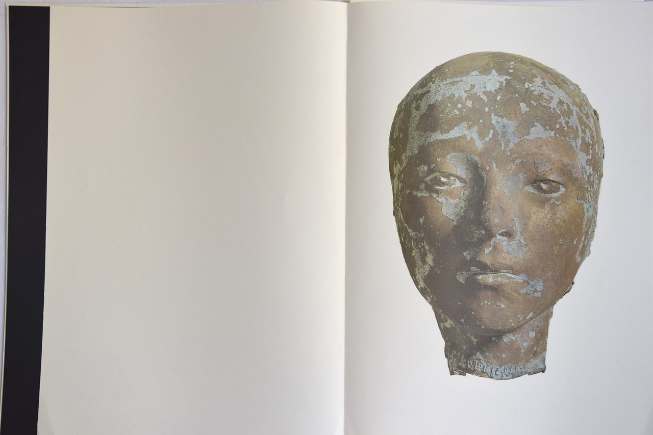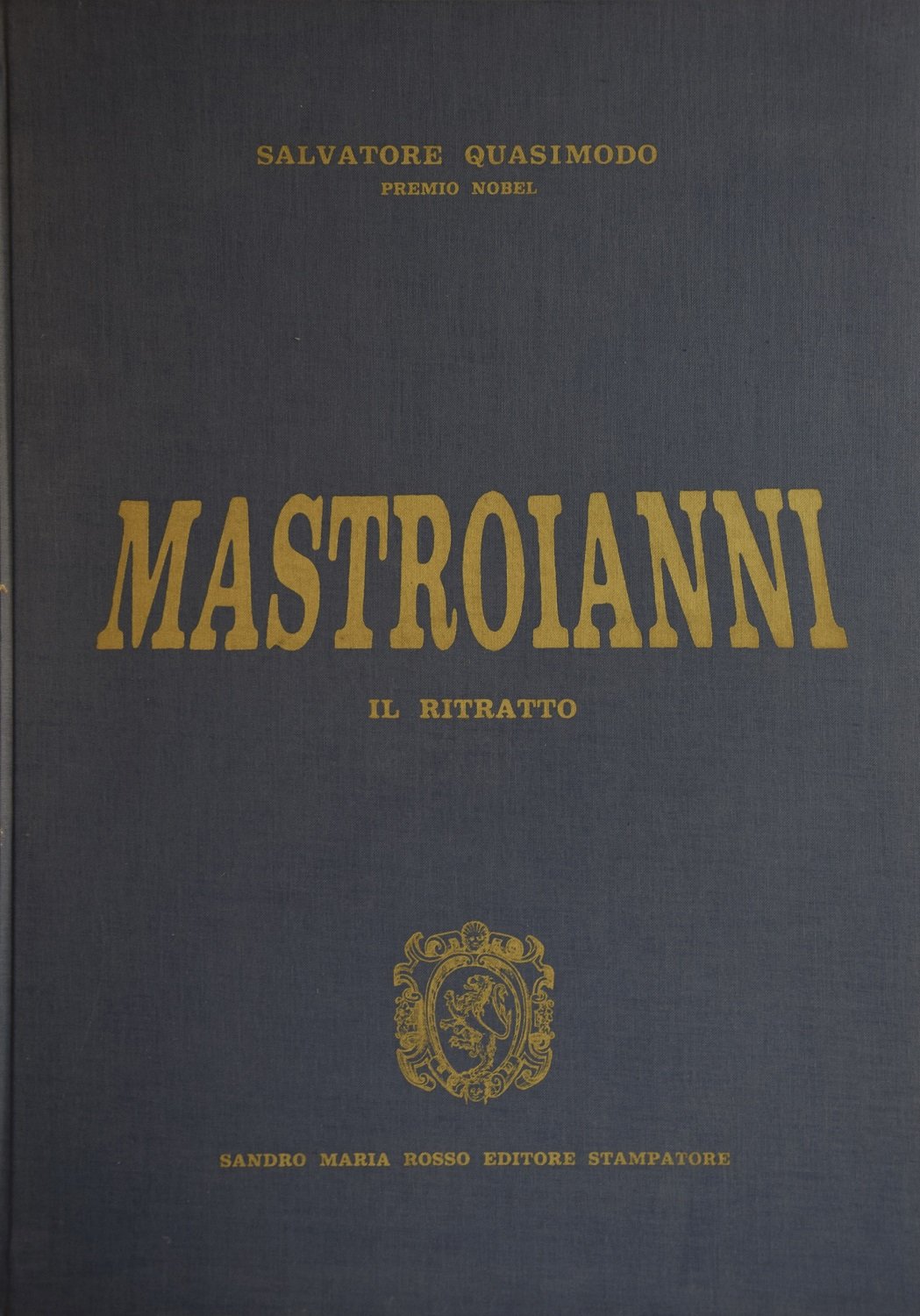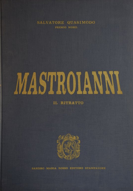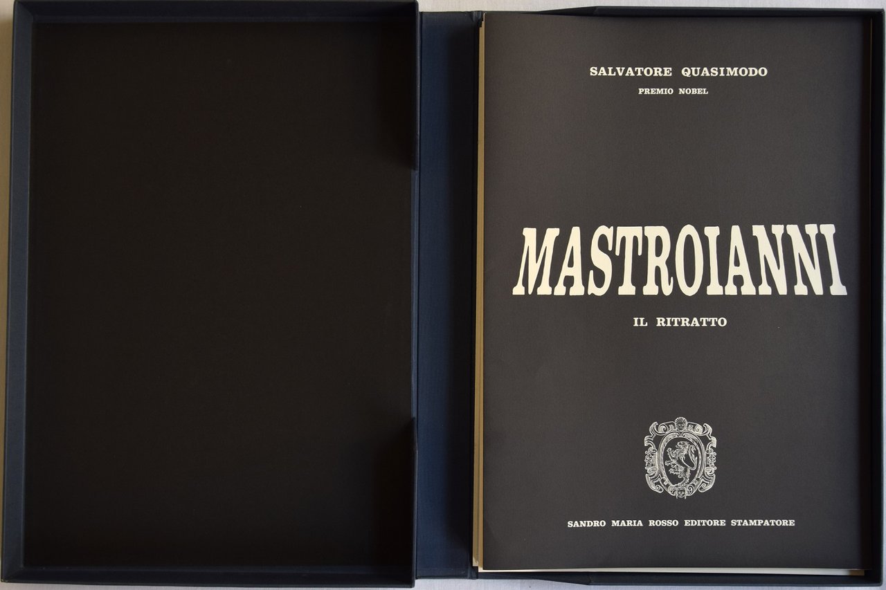 Uno scritto di Salvatore Quasimodo su Mastroianni, riprodotto in facsimile dall'originale autografo. 51 grandi belle tavole a colori e in bianco e nero che comprendono riproduzioni di ritratti di Mastroianni e varie interpretazioni grafiche dello stampatore Sandro Maria Rosso (cm 48x33) Esemplare N. 28. Folio (cm 48x34). pp. 172. . Molto buono (Very Good). . Edizione originale di 1000 esemplari numerati e firmati a matita da Mastroianni (Original edition of 1000 numbered copies, signed by Mastroianni). .