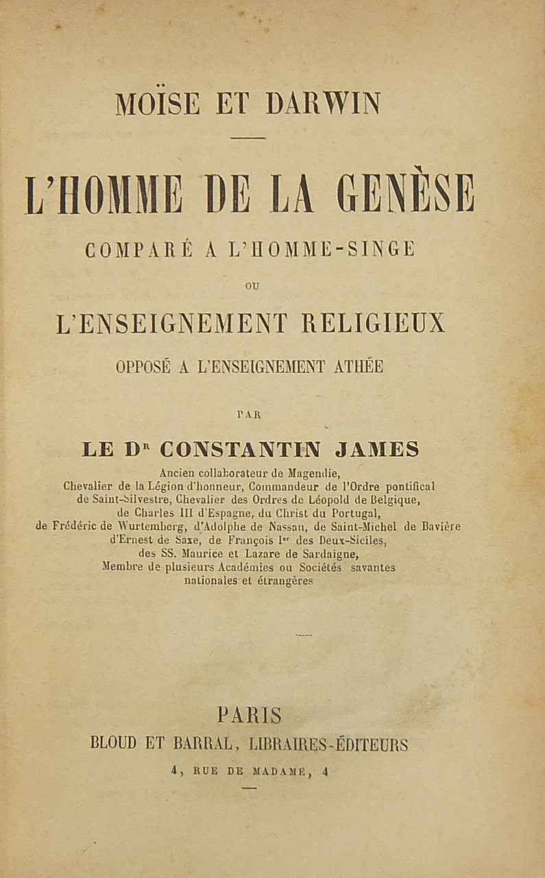 Moise et Darwin. L'homme de la Genese compare a l'homme singe ou l'enseignement religieux oppose a l'enseignement athee | Libros antiguos y modernos | James Constantin