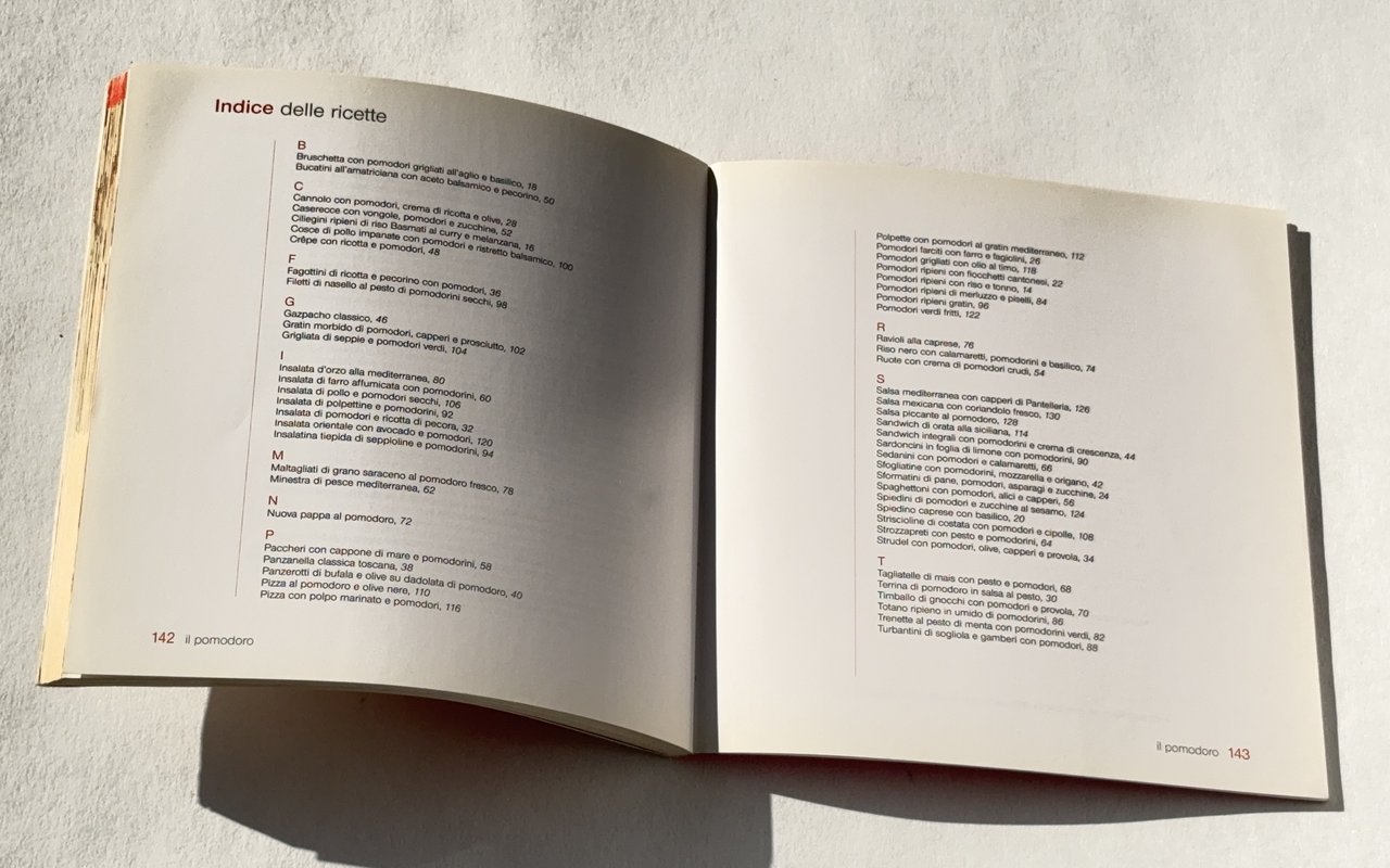 I ed.: Finito di stampare nel mese di aprile 2006. Coordinamento di redazione: Monica Nastrucci. Responsabile marketing e ufficio stampa: Emanuela Vibi. Hanno collaborato: Francesca Badi, Cristina Bottari, Giacomo Gazzola, Giusy Giuffrida, Gino Marazzini, Armando Minuz, Maria Grazia Pacchioni, Monia Petrolini, Marco Pozzati (vini), Antonella Uccelli. Si ringrazia (per due ricette, rispettivamente): Alfonso Caputo, Angelo Troiani. VIII quasi quadro/144/brossura satinata con grafica in rosso/bianco ed illustrata a colori ai piatti. Illustrazioni fotografiche a colori nel testo e f.t.. Progetto grafico: Daniela Beati. Impaginazione: Food Editore Srl, Iskra Grafica & Comunicazione. Fotografie: Davide Di Prato e Alberto Rossi. Stato buono (leggera usura - leggermente brunito nel complessso). Indice: Il pomodoro in cucina - Le ricette - Il pomodoro per tutti gli usi - Attrezzi da cucina - Glossario - Indice delle ricette.