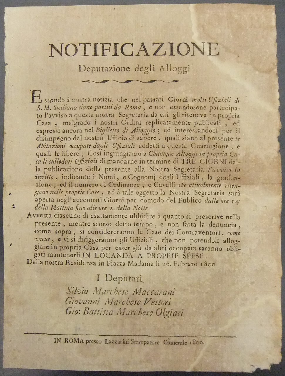 Notificazione. Deputazione degli alloggi. Denuncia degli alloggi ancora occupati dagli ufficiali della Repubblica Romana | Libros antiguos y modernos | Ferdinando Iv - Marchese Maccarani