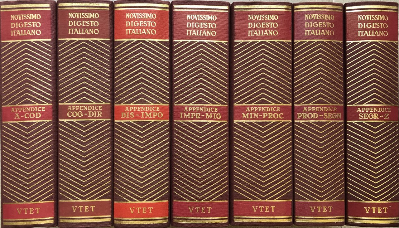 Novissimo Digesto Italiano. Diretto da Antonio Azara e Ernesto Eula. Appendice I - A-COD; Appendice II - COG-DIR; Appendice III - DIS-IMPO; Appendice I - V - IMPR-MIG; Appendice V - MIN-PROC; Appendice VI - PROD-SEGN; Appendice VII - SEGR-Z