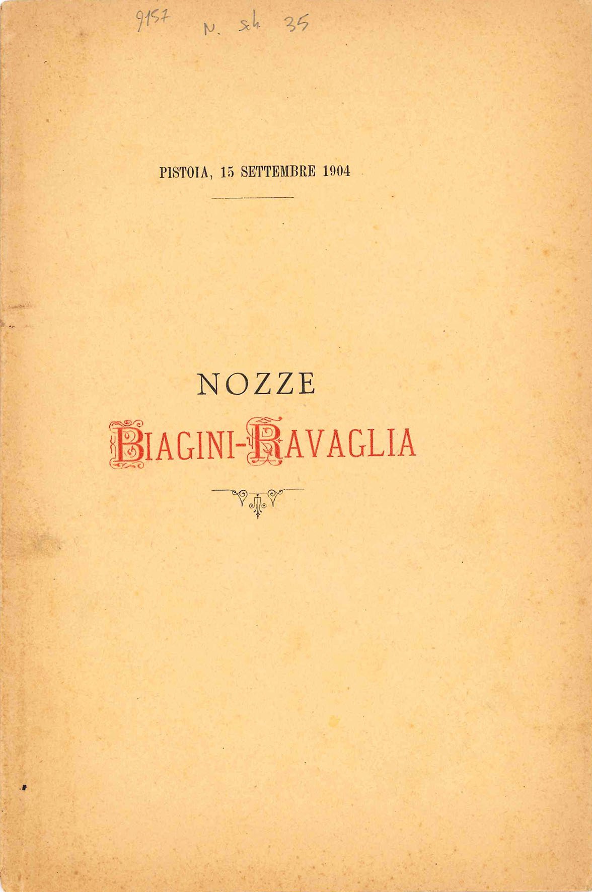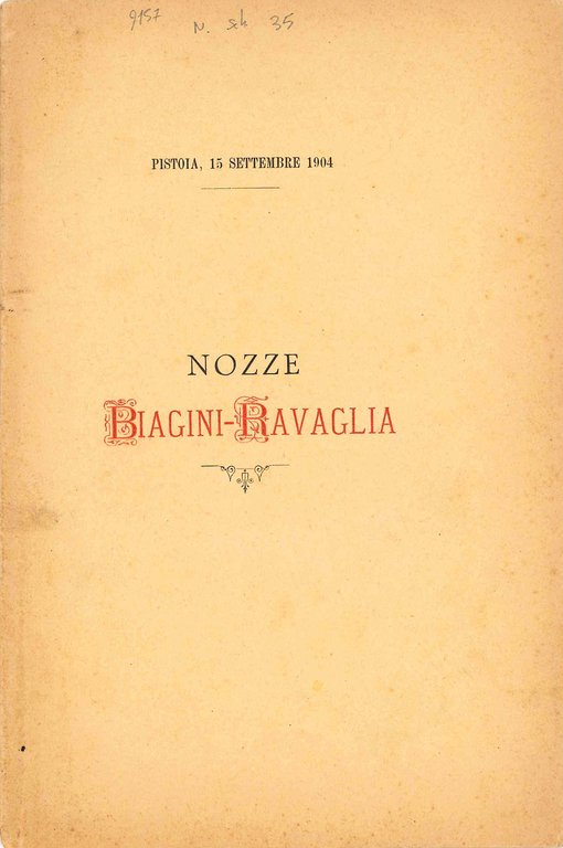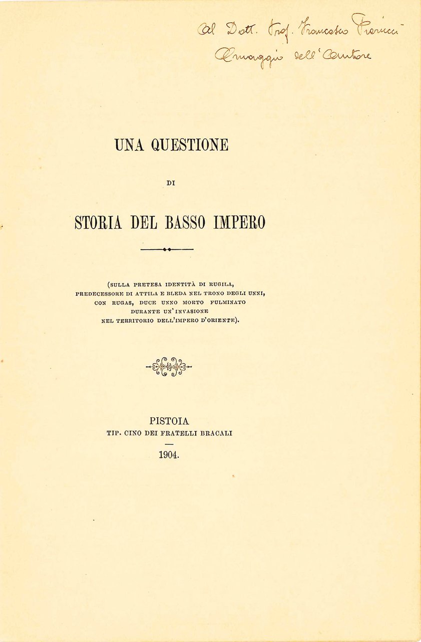 Mm. 217 x 143. Pp. 17, [3 bianche]. Brossura coeva brunita e con lievi fioriture, con titolo bicolore alla prima di copertina. Dedica allo sposo Guido Biagini per felicitarsi delle nozze con Giuseppina Ravaglia celebratesi a Pistoia in data 15 settembre 1904, da parte dell'amico Carlo Bugiani, autore del breve trattato di seguito, intitolato Una questione di storia del Basso Impero: sulle pretesa identità di Rugila, predecessore di Attila e Bleda nel trono degli Unni, con Rugas, duce unno morto fulminato durante un'invasione nel territorio dell'Impero d'Oriente. Dedica manoscirtta dell'autore, che dona l'esemplare al Dott. Prof. Francesco Pierucci.