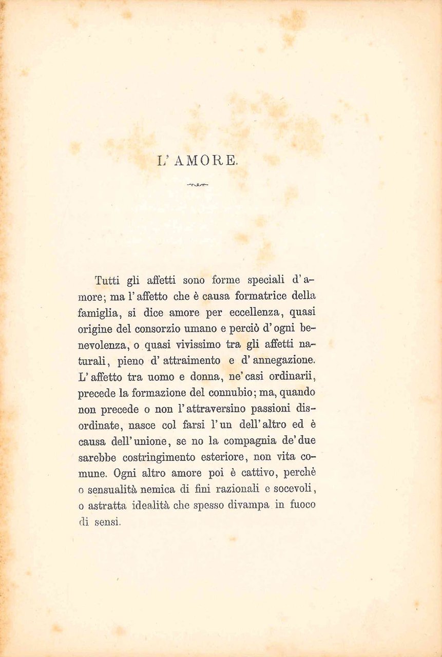 Mm. 200 x 135. Pp. 8, [4 bianche]. Brossura coeva, leggermente brunita e con fioriture. Primi due fogli ancora chiusi. Dedica dell'amico Luigi Casolini allo sposo Eugenio, firmata da Messina nel Maggio 1876: segue l'articolo da lui pubblicato, e fino ad allora inedito, di Augusto Conti, intitolato L'Amore.