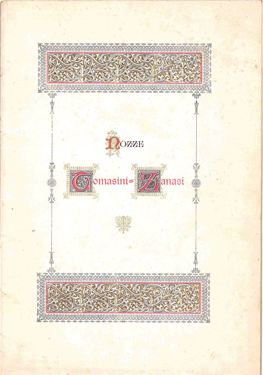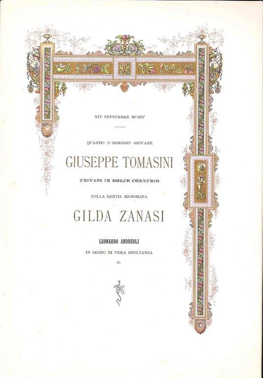 Mm. 291 x 200. Pp. [18]. Brossura coeva in carta patinata lucida, con titolo entro elaboratissima cornice con fregi dorati e capilettera di colore rosso. Elaborata marca tipografica della Premiata Reale Tipografia e Cartoleria del Cav. Leonardo Andreoli di Bologna. Dedica allo sposo Giuseppe Tomasini, per felicitarsi delle nozze con la signorina Gilda Zanasi avvenute a Bologna in data 14 settembre 1904, da parte dell'amico Leonardo Andreoli, Ministro per gli Affari di Coniugaione e Moltiplicazione, entro elaboratissima cornice dorata in stile Liberty, con elementi sinuosi e floreali colorati, ripetuta in tutta le pagine. Seguono diversi sonetti e odi: