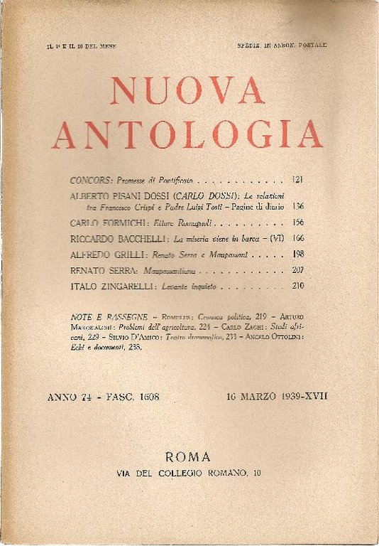 Scritti di Concors (Promesse di Pontificato), Carlo Dossi (Le relazioni tra Francesco Crispi e Padre Luigi Tosti - Pagine di diario), Carlo Formichi (Ettore Romagnoli), Riccardo Bacchelli (La miseria viene in barca - VI), Renato Serra (Maupassantina), et al. Note e rassegne di Romulus, Arturo Marescalchi, Carlo Zaghi, Silvio D'Amico e Angelo Ottolini . 8vo. pp. 118. . Molto buono (Very Good). . . .