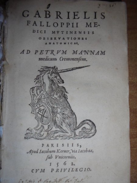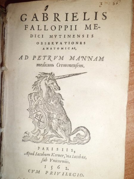 Falloppio, Gabriele. Parisiis, apud Iacobum Kerver, 1562. In - 8°, pergamena molle coeva. 133, (1) ff. Insegna tipografica nel frontespizio e grande fregio in fine incisi in legno. Esemplare ben conservato. Rarissima seconda edizione pubblicata l' anno dopo la prima (1561). Manca al Durling (N.L.M.), alla Wellcome Library a al Waller. << Falloppio studied unter Vesalius and became professor of anatomy, at Ferrara (1547), Pisa (1548) and Padua (1551). He discovered chords tympani and semicircular canals, correctly describet the structure and course of the cerebral vessels, know the circular folds of the small intestines. He enumerated ell the nerves of the eye, and introduced a number of anatomical names. He is eponymously remebered by the Fallopium tubes and the Falloppian aqueduct >> (Garrison - Morton, 378.2), 1208 e 1537. Hirsch, II, p. 475. D.S.B., IV, pp. 519 - 21. Norman, 757. Haller, Bibl. anat. I, p.zzi. Dobson, Anat. eponyms, p. 65. Schmidt, Med. discoveries, p. 522. Mieli, Scienziati italiani, II, pp. 43 - 59.