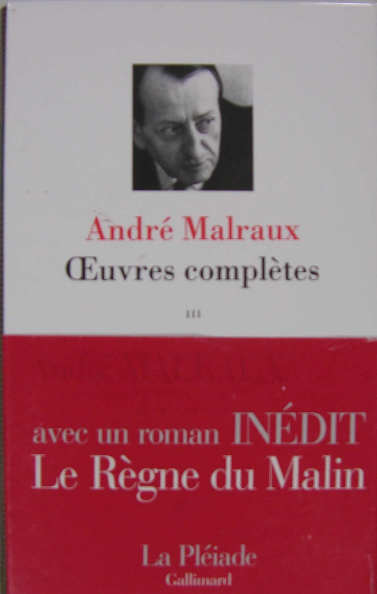 Bibliothèque de la Pléiade N° deux cent soixante-trois, ce volume faisant partie d'une nouvelle édition des "Ooeuvres complètes" André Malraux, nfr, 1996, in/8 reliure éditeur en pleine peau dorée à l'or fin 23 carats, jaquette, Rhodoïd et étui, 1428 pages. Introduction par Larrat et Fraznçois Trécourt. par Marius-François Guyard, avec la collaboration de Jean-Claude Tome III au Miroir des limbes