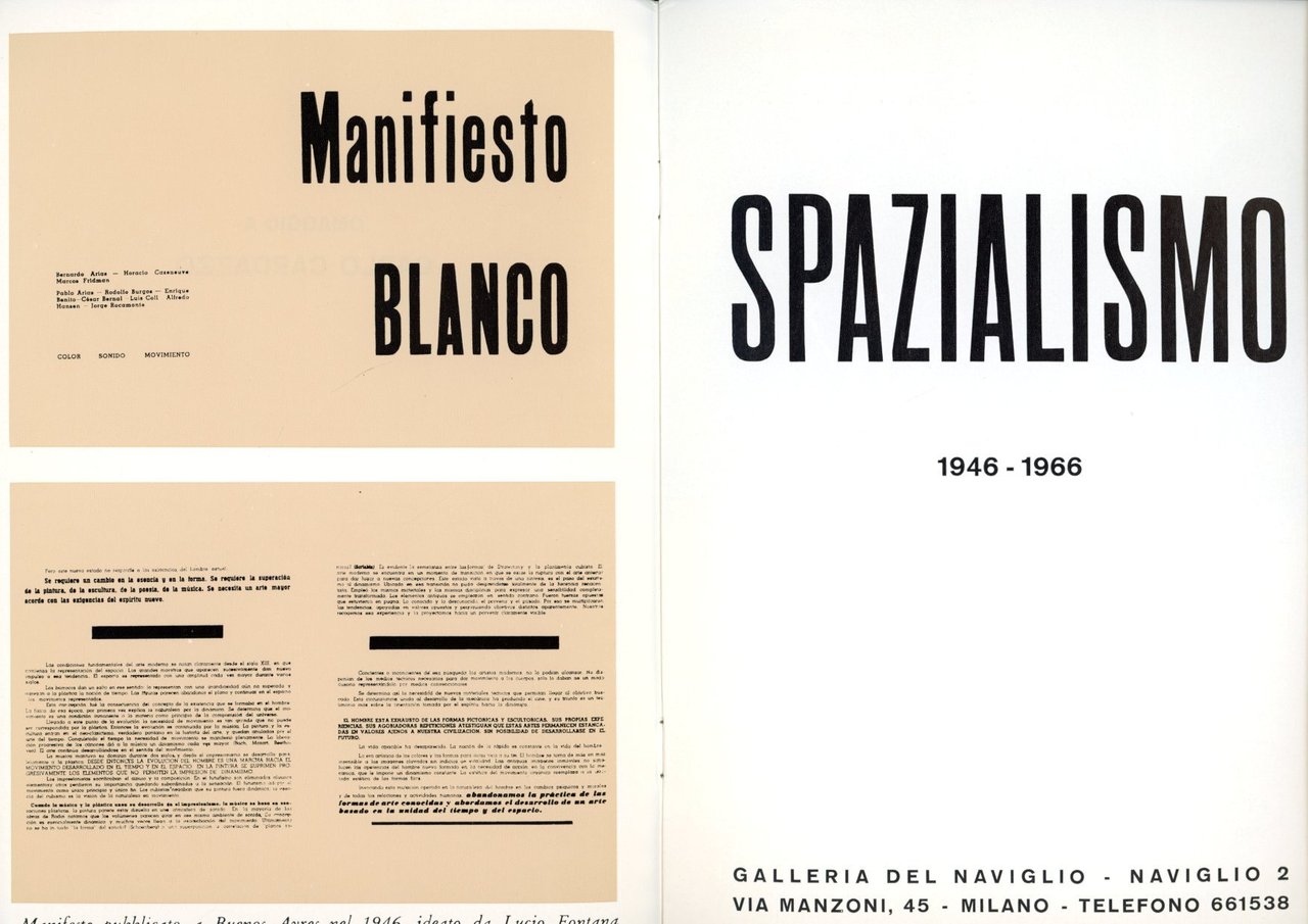 Catalogo stampato in occasione della 460ma Mostra del Naviglio, dedicata a Carlo Cardazzo, Milano, 16 novembre - 8 dicembre 1966. Con un testo di Carlo Cardazzo e 10 fotografie degli artisti spazialisti. . Cm 23x16. pp. 16. . Ottimo (Fine). . Edizione originale (Original edition). .