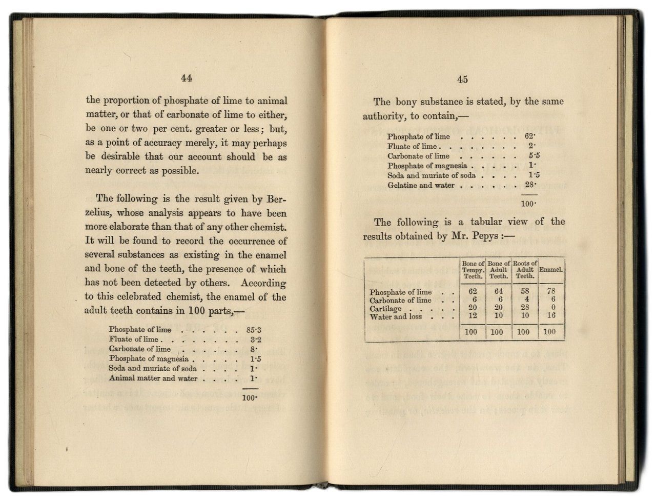 >in-16, pp. 61, (3), e una figura mobile in antiporta; legatura editoriale in percallina, autore e titolo impressi in oro al centro del piatto superiore, racchiusi entro bordura floreale impressa a secco. Opera dedicata alla perdita dei denti ed al metodo per sostituire i denti mancanti con denti artificiali. Deliziosa l'incisione impressa in blu che precede il titolo: osservando la tavola con la parte mobile appoggiata a quella inferiore, si vede il volto di una giovane donna senza denti con i tratti simili a quelli di un anziana; sollevando la parte superiore, appare il volto della donna ringiovanita grazie all'impianto di denti artificiali. Alla fine del volumetto si leggono l'indirizzo e l'orario di ricevimento del medico. Ottimo esemplare.