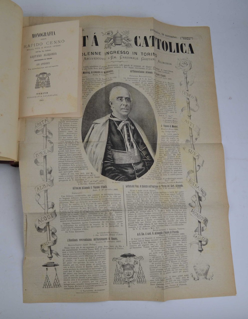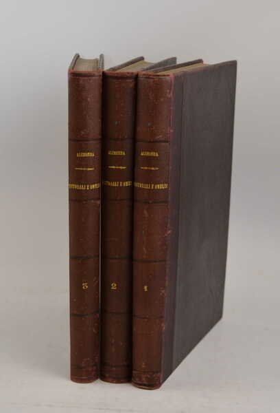 Tre volumi di cm. 26, pp. 1500 ca. complessive. Solida legatura del tempo in mezza tela con titoli in oro ai dorsi. Ottimo stato di conservazione. Raccolta che comprende circa 30 opere di Gaetano Alimonda (Genova, 1818-1891), cardinale e arcivescovo, vescovo di Albenga e arcivescovo di Torino nel 1883. Allegati anche alcuni giornali d'epoca.