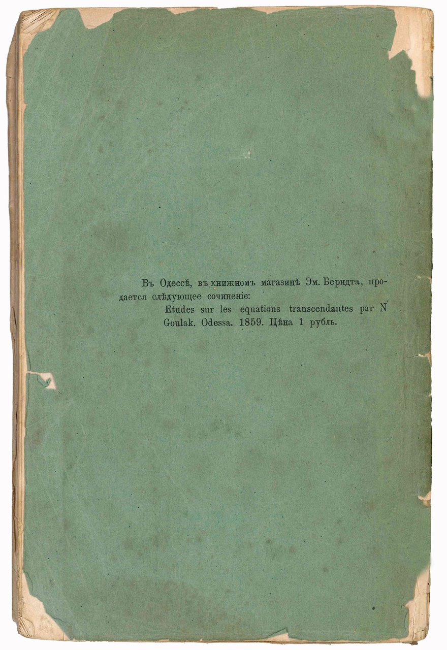 Hulak had been interested in mathematics even before the Brotherhood was founded. While in prison, he studied the subject and later carried out research primarily related to non-Euclidean geometries and four-dimensional space. In 1859, he published “Studies on Transcendental Equations” in Odessa, and in 1877, he published the present work in Tbilisi (cf. M. Briefly & O. Antonyuk, Mikola Gulak as a mathematician: Monograph, Lutsk, 2004).