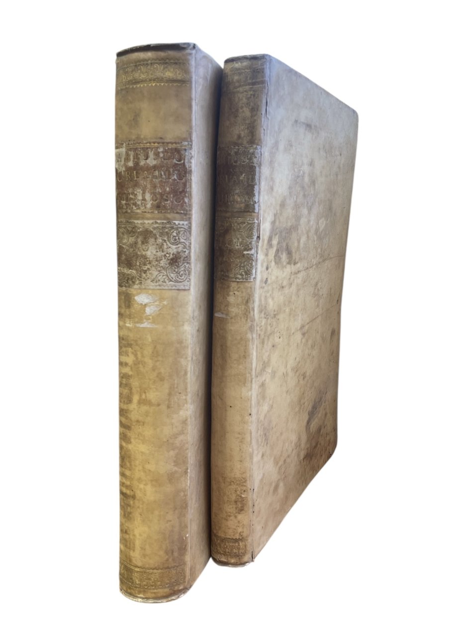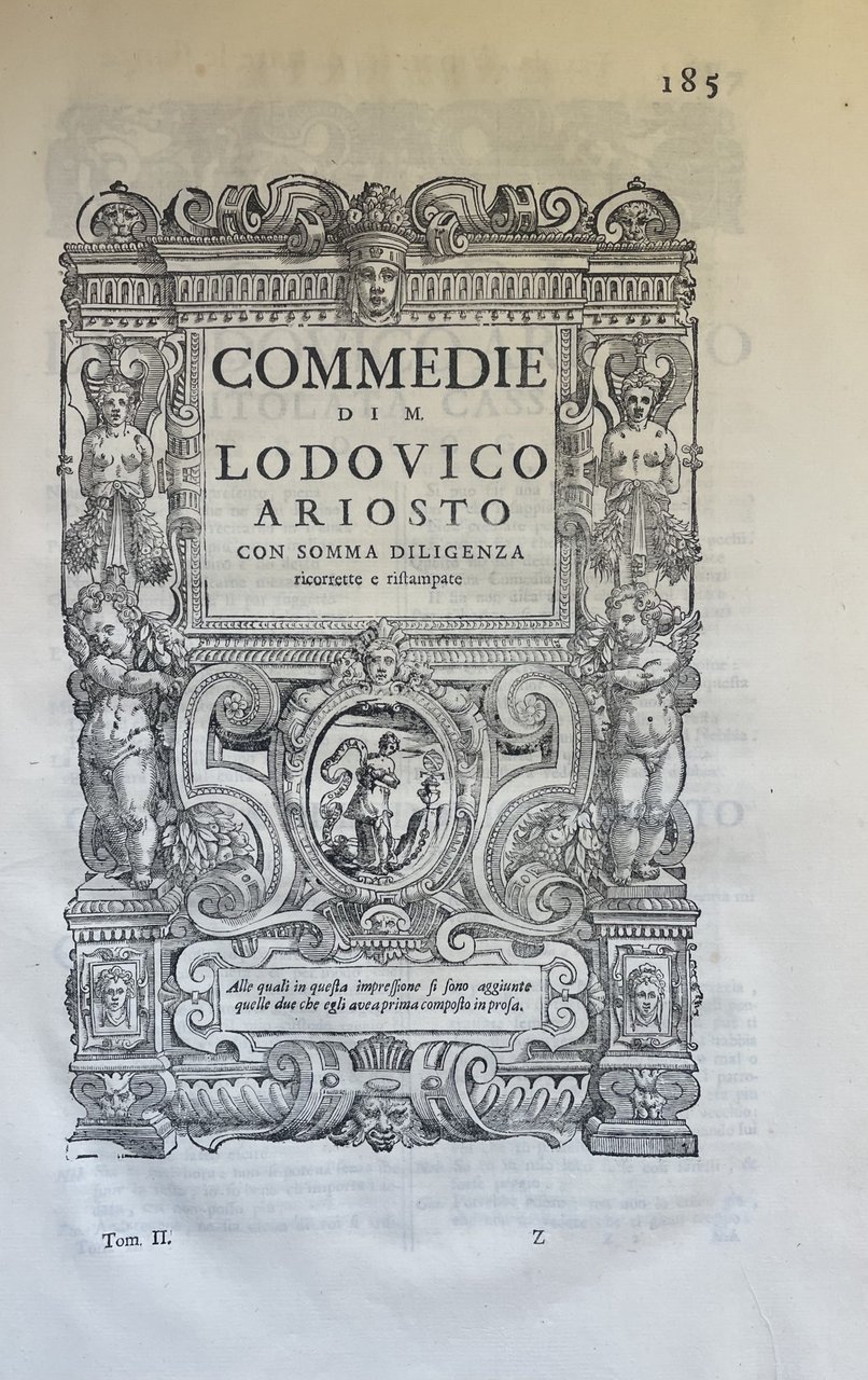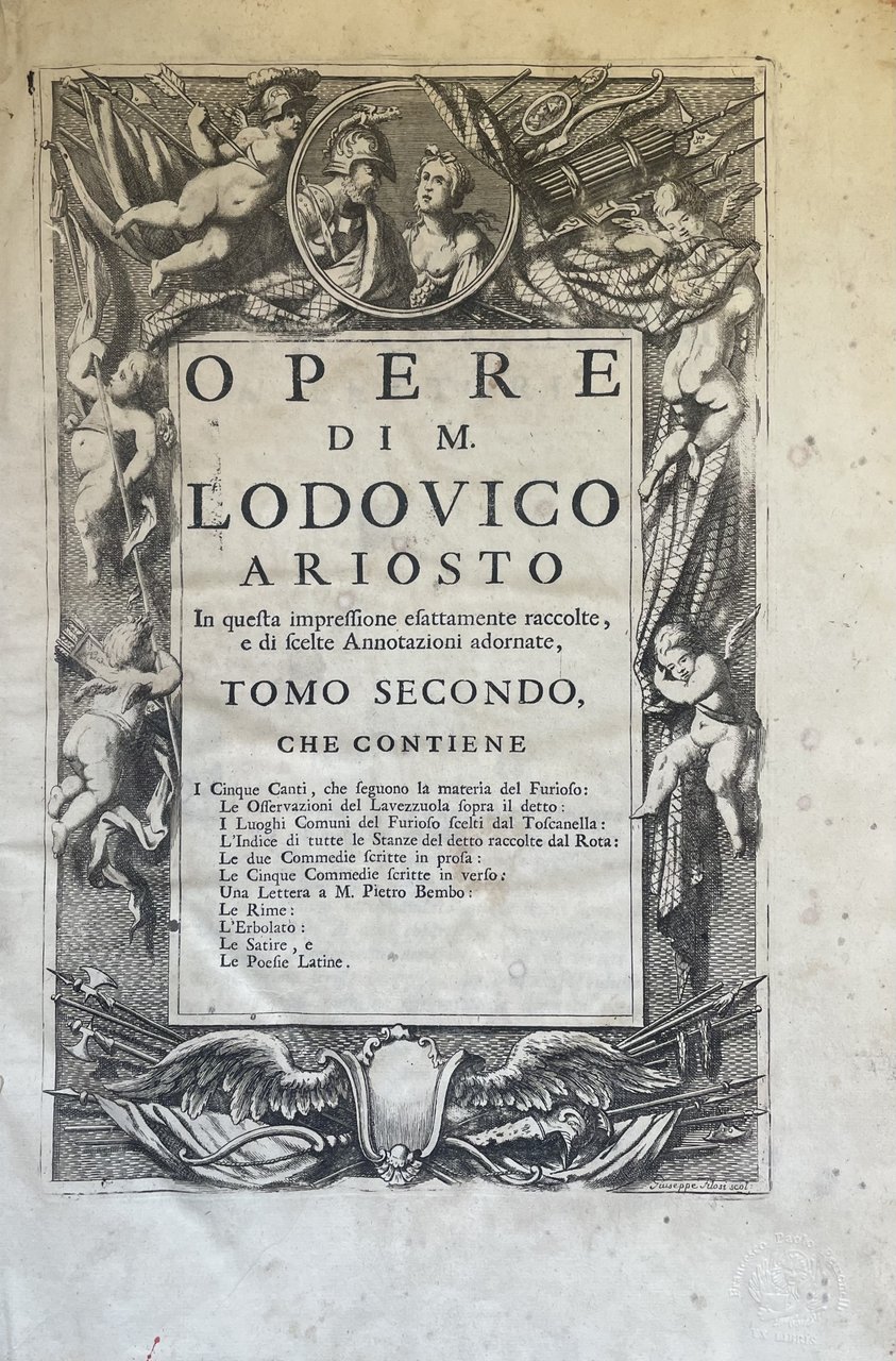 Il primo volume contiene l' Orlando Furioso (con la prefazione di Valvassori, la vita dell' autore scritta dal Pigna, dal Garofalo e dal Fornari; l'allegoria del Bonomone, le allegorie dei nomi propri del Toscanella, il paragone dei luoghi, delle storie e delle favole di Fausto da Longiano, il catalogo delle migliori edizioni del poema compilato da Pier Catterino Zeno e gli avvertimenti del Ruscelli). Il secondo volume contiene gli ultimi Cinque Canti dell'Orlando, le osservazioni sopra il Furioso del Lavezzuola, i luoghi communi commentati dal Toscanella, la Tavola de' pincipi di tuttte le stanze redatta da M. Giovan Battista Rota Paduano, cinque Commedie, una lettera diretta a Pietro Bembo, le Rime, le Satire, l' Erbolato e delle poesie latine dell'autore. 47 tavole f. t. (compreso il ritratto di Ariosto inciso da Carlo Orsolini) e 5 tavole f. t. per i 5 Canti contenuti nel secondo volume. in folio leg. pergamena con titolo al tassello al dorso, tagli spruzzati 2 voll.: tomo I: (48), 576; tomo II: (4), 400 Buono (Good) Buon es., lievi difetti alla legatura e qualche sporadica e trascurabile traccia di foxing.