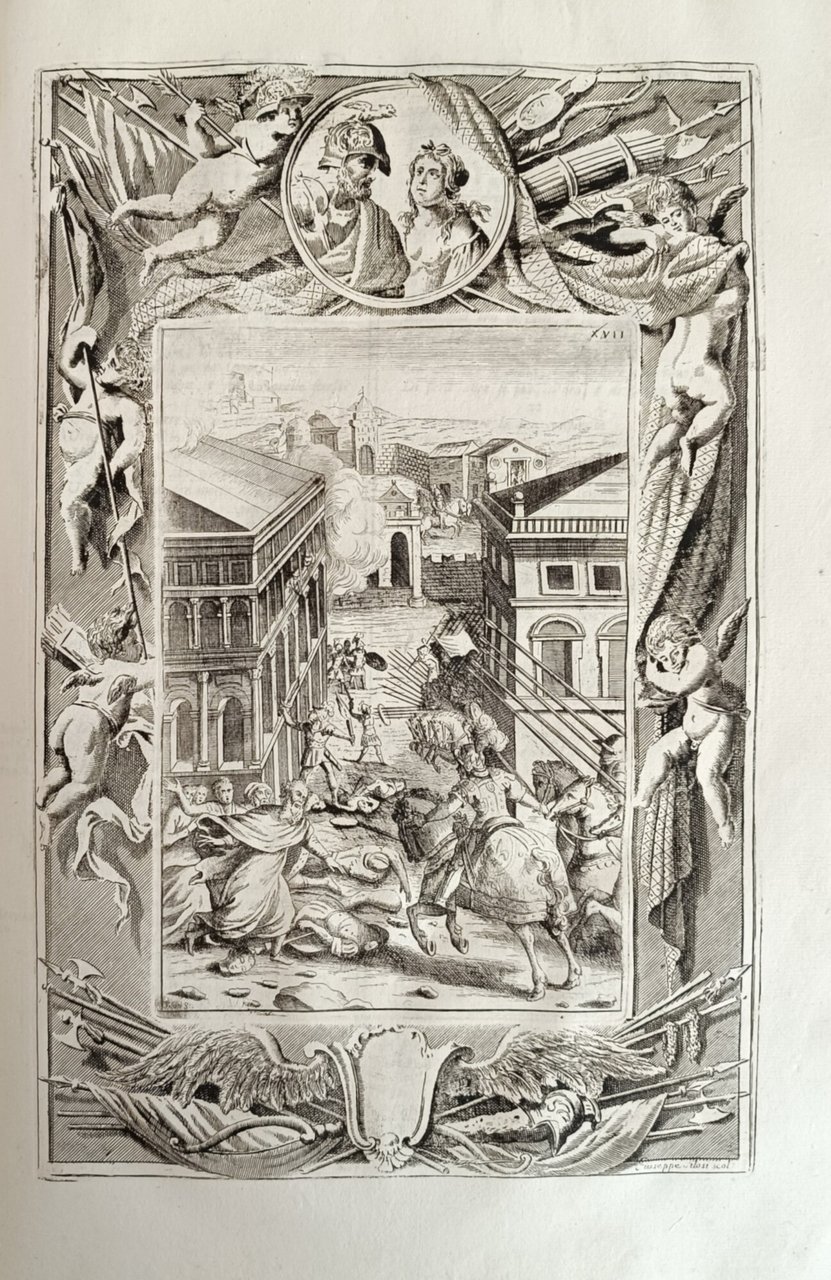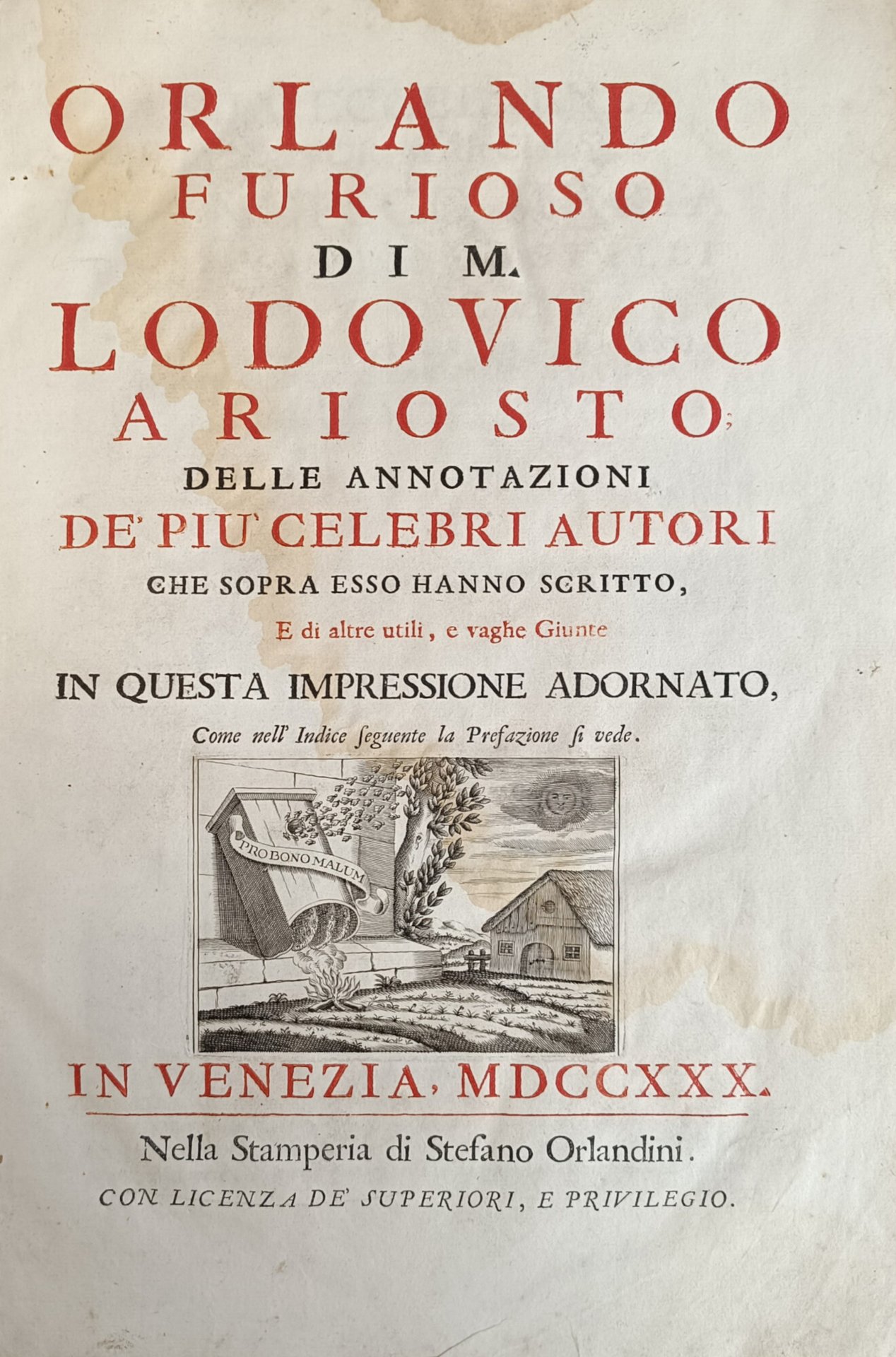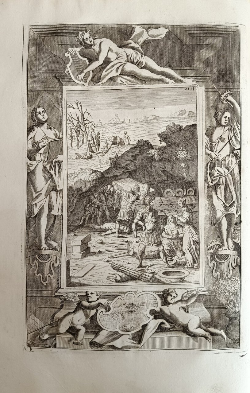 Il primo volume contiene l' Orlando Furioso (con la prefazione di Valvassori, la vita dell' autore scritta dal Pigna, dal Garofalo e dal Fornari; l'allegoria del Bonomone, le allegorie dei nomi propri del Toscanella, il paragone dei luoghi, delle storie e delle favole di Fausto da Longiano, il catalogo delle migliori edizioni del poema compilato da Pier Catterino Zeno e gli avvertimenti del Ruscelli). Il secondo volume contiene gli ultimi Cinque Canti dell'Orlando, le osservazioni sopra il Furioso del Lavezzuola, i luoghi communi commentati dal Toscanella, la Tavola de' pincipi di tuttte le stanze redatta da M. Giovan Battista Rota Paduano, cinque Commedie, una lettera diretta a Pietro Bembo, le Rime, le Satire, l' Erbolato e delle poesie latine dell'autore. 47 tavole f. t. (compreso il ritratto di Ariosto inciso da Carlo Orsolini) e 5 tavole f. t. per i 5 Canti contenuti nel secondo volume. in folio leg. pergamena con titolo al tassello al dorso, tagli spruzzati 2 voll.: tomo I: (48), 576; tomo II: (4), 400 Buono (Good) Buon es., lievi difetti alla legatura e qualche sporadica e trascurabile traccia di foxing.