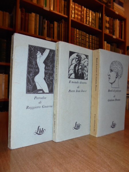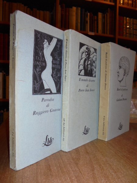 Ruggiero, Guarini. Pierre Jean Jouve. Giuliano, Pirotta. Milano-Parma, Franco Maria Ricci Editore, 1973-74. Parodia di Ruggiero Guarini. Il Mondo deserto di Pierre Jean Jouve. Barili di polvere di Giuliano Pirotta. 3 volumi in-8°, cart. edit. con alette. 225 pp.; 203 pp.; 335 pp. In buono stato di conservazione. Neg. Magaz. mob.