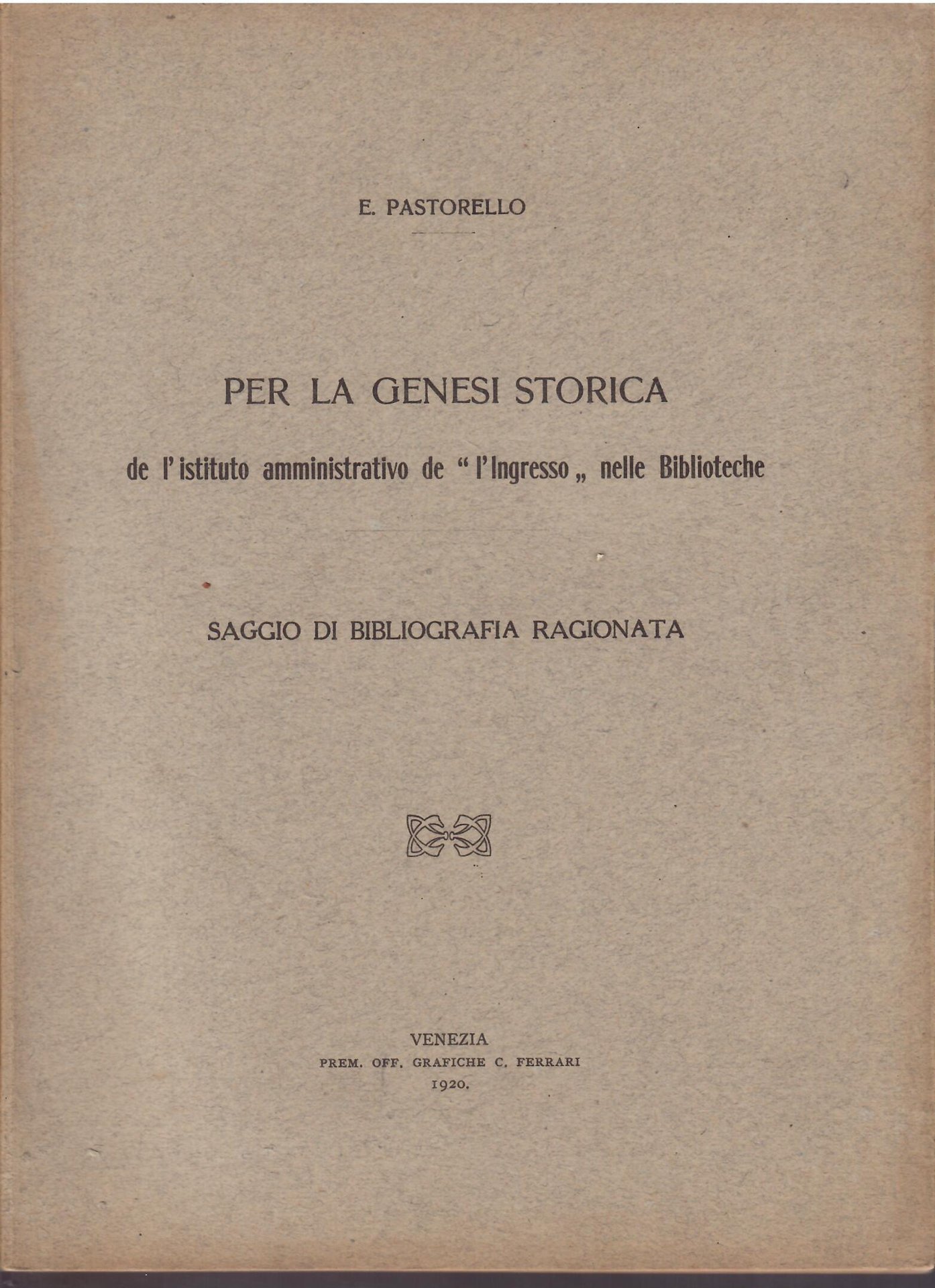 PER LA GENESI STORICA DE L'ISTITUTO AMMINISTRATIVO DE " L'INGRESSO " NELLE BIBLIOTECHE | Libros antiguos y modernos | E. Pastorello