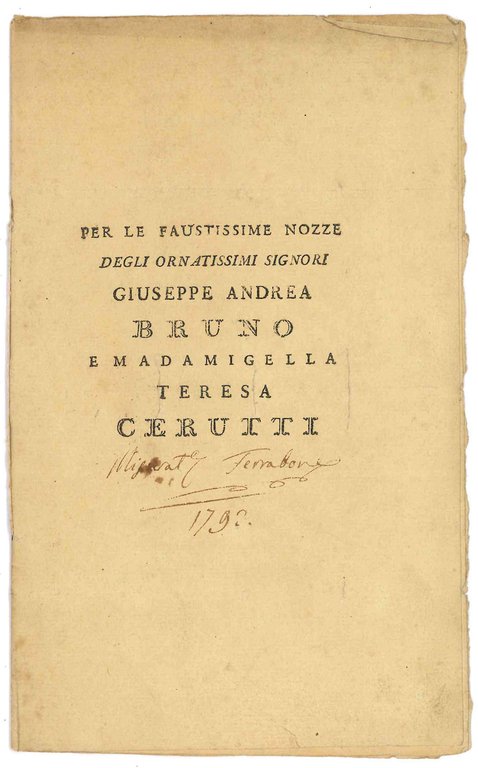 In 8vo (mm. 195x120). Pp. VIII. Cucito ma senza legatura. Carta leggermente brunita e con un piccolo foro di tarlo. Contiene un'ode anonima dedicata agli sposi, e sul titolo porta una firma manoscritta parzialmente leggibile ("Mis[...]at Ferrabone 1792").