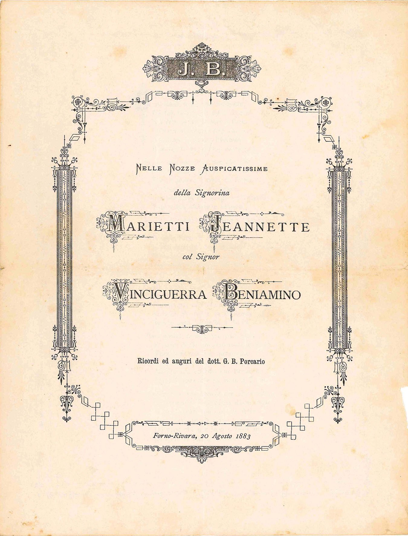 Mm. 273 x 210. Pp. [4]. Bifoglio lievemente brunito con segni di piegatura e minime mancanze marginali. Dedica agli sposi Jeannette Marietti e Vinciguerra Beniamino dal dott. G. Porcario, inserita entro elaborata cornice xilografica, sormontata da un fregio recante le iniziali degli sposi. Segue un componimento anonimo in dialetto piemontese, ento cornice xilografica.