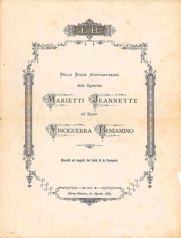 Per le nozze auspicatissime della Signorina Marietti Jeannette col Signor Vinciguerra Beniamino.