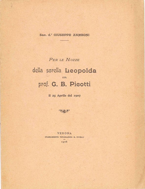 Per le nozze della sorella Leopolda col prof. G. B. Picotti il 25 aprile del 1907. | Libros antiguos y modernos | ZAMBONI, Giuseppe (1875-1950)