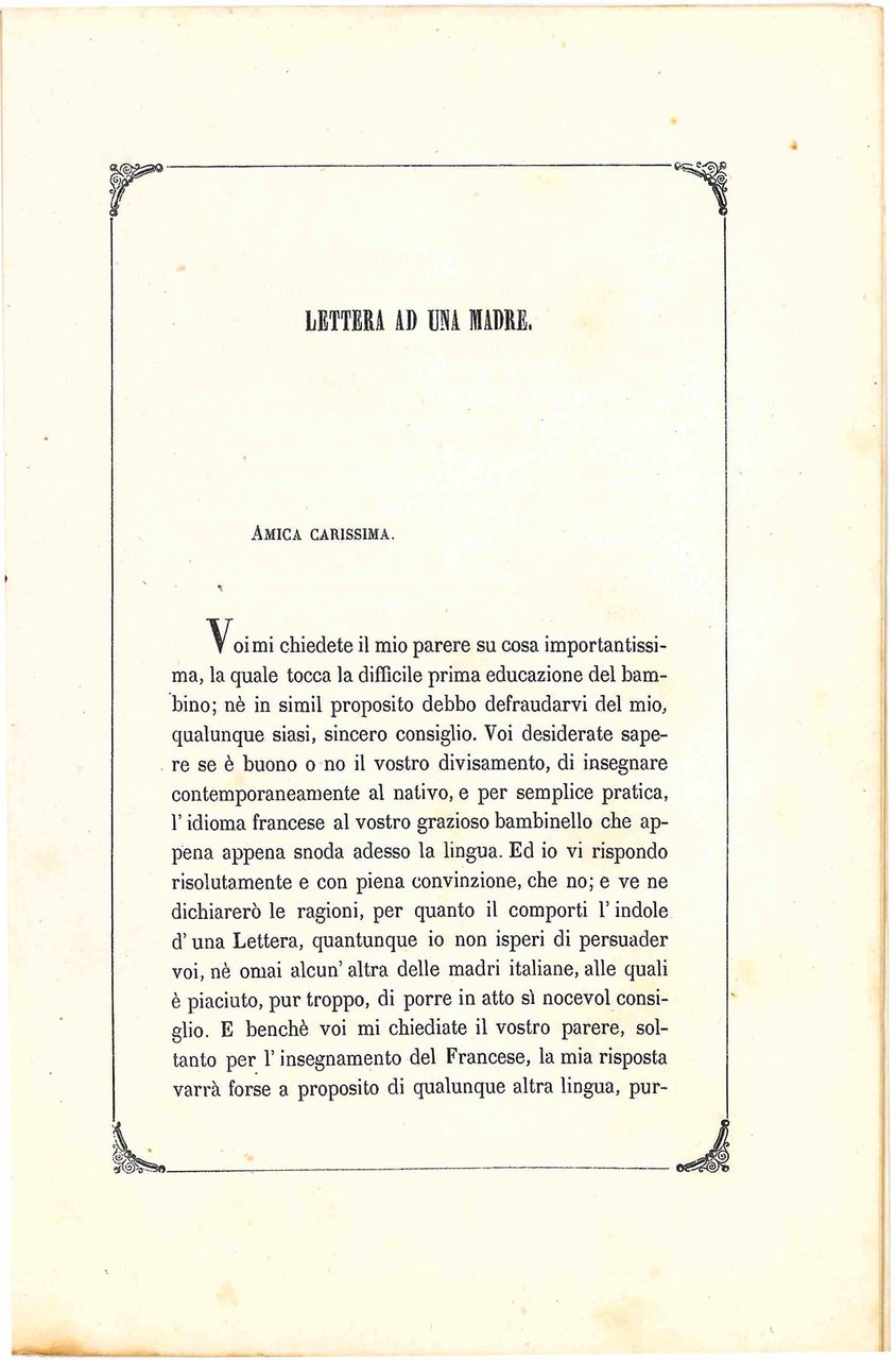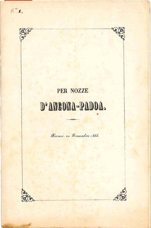 In 8vo (mm 225 x 145). Pp. 15, [2]. Brossura coeva, sciolta e leggermente brunita. Copertina con cornice e fregi xilografici ai 4 lati, motivo ripetuto in ciascuna pagina del libretto. Dedica alla sorella, sposa di Emanuele Padoa, da parte di Alessandro D'Ancona, autore anche del testo di seguito, titolato Lettera ad una madre, circa la corretta educazione di un figlio. Alessandro D'Ancona fu una figura centrale della cultura italiana postunitaria, tra i più autorevoli studiosi e divulgatori della tradizione letteraria nazionale. Critico raffinato, storico della letteratura e docente universitario, contribuì in modo decisivo alla diffusione e alla valorizzazione degli studi italiani in un momento cruciale per la formazione dell'identità culturale del Paese. Partecipe degli ideali del Risorgimento, unì all'impegno civile una rigorosa attività accademica, distinguendosi per l'ampiezza degli interessi e la solidità del metodo.