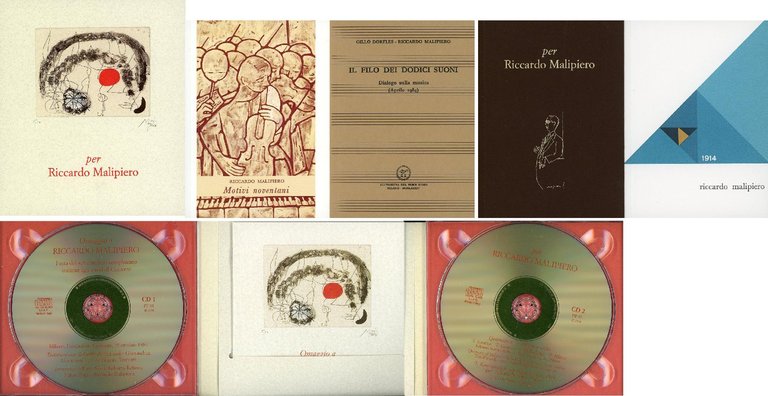 Cofanetto con 5 volumi e un doppio CD Volume I: Ricordo Riccardo, lebensruckblick 1959-1984 a cura di Paolo Franci; Volume II: Motivi noventani, Ristampa dell'edizione della Strenna per gli amici, All'Insegna del Pesce d'Oro, Milano 1959; Volume III: Piccolo omaggio a Riccardo Malipiero, Ristampa dell'edizione della Strenna per gli amici, All'Insegna del Pesce d'Oro, Milano 1964; Volume IV: Per Riccardo Malipiero, con 3 testi di Riccardo Malipiero, uno di Quirino Principe, uno di Gillo Dorfles e un manoscritto inedito dedicato dal musicista a Paolo Franci; Volume V: Il filo dei dodici suoni, dialogo sulla musica di Gillo Dorfles e Malipiero, edizione ridotta del volume edito da Scheiwiller nel 1984. Con un doppio Cd: CD 1: Festa del settantesimo compleanno insieme agli amici di Corrente; CD 2: Quartetto n. 3 del 1960, Konzertstuck per Paolo Franci 1974 (inedito) Stampato nell'officina d'arte grafica Lucini, Milano. 24mo. pp. 20 + 34 + 70 + 150 + 50 + CD doppio. . Perfetto (Mint). . . .