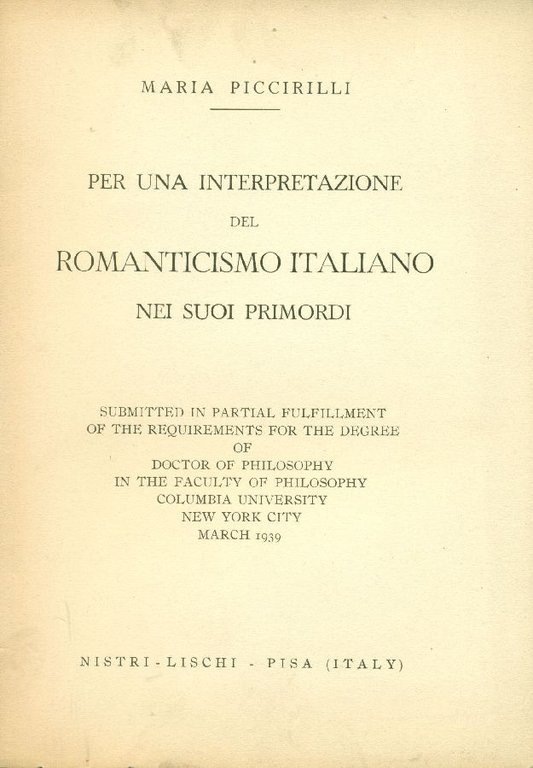 Per una interpretazione del Romanticismo italiano nei suoi primordi | Libros antiguos y modernos | PICCIRILLI Maria,