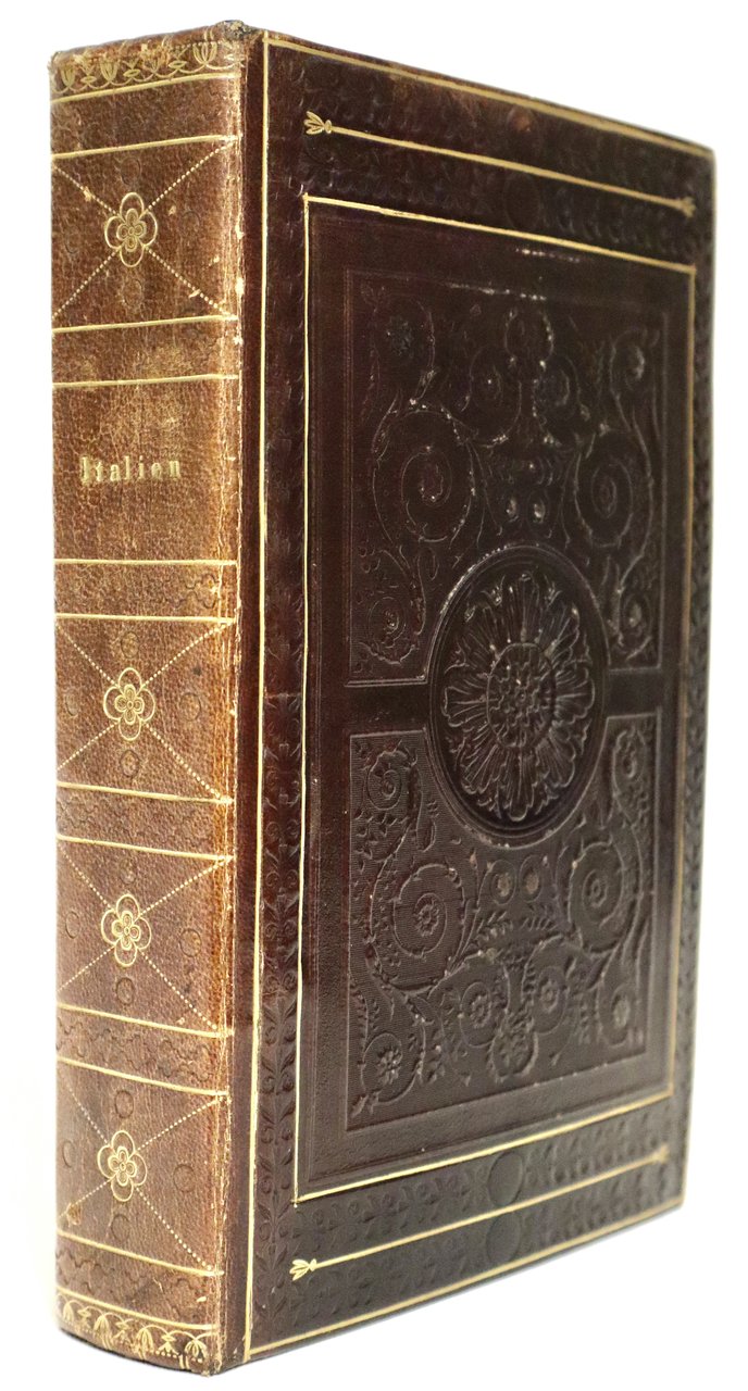 In 8° (mm 240x140); 3 parti in un tomo, pagg. X, 574, (4) con 103 incisoni in acciaio fuori testo, fra cui 52 vedute di città, 48 costumi e scene perlopiù da Pinelli e Gail, leggermente più piccoli e 3 vignette in acciaio ai frontespizi. Bella descrizione di viaggio in Italia divisa in "Ober-Italien" di W. Von Luedemann, "Unter-Italien" di Karl Witte. Testo tedesco. Fra le belle vedute il Sempione i laghi dell'alta Lombardia, Milano, Trento, Verona, Vicenza, Padova, Venezia, Genova, Torino, Bologna, Perugia, Siena, Firenze, alto lazio, Roma e dintorni, Napoli e dintorni classici, reggio Calabria e Scilla.Ottimo esemplare con bellissima legatura romantica tedesca in piena pelle con fregi a secco e in oro, tagli e spigoli dorati