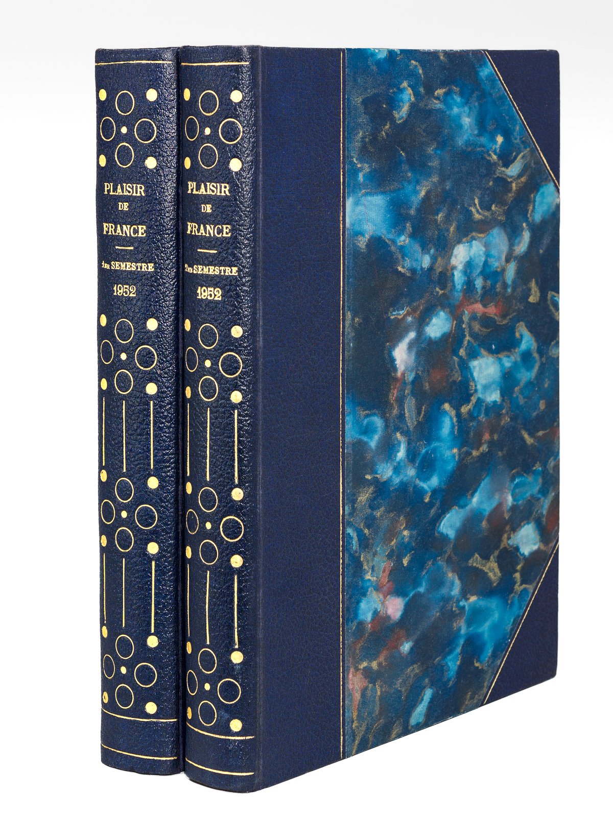 2 vol. grands in-4 reliure demi-percaline bleue à coins signée Richard, couvertures conservées, ill. noir et blanc ou couleurs, Les Publications de France, 1952, env. 70-XX pp. par numéro, soit environ 900 pp. au total. Bel exemplaire (lég. rouss. sur tranches, très bon état par ailleurs). Peu courant ainsi relié. D'autres années, reliées dans le même style, sont disponibles dans notre catalogue. "Plaisir de France" était une revue de prestige, lancée en 1934 par le Rayonnement français, une filiale du groupe familial Baschet. A partir de 1936, et jusqu'en 1968, elle fut dirigée par Olivier Quéant (1898-1988). Cette revue, réputée pour son esthétique et sa qualité graphique, fusionna en 1974 avec "Connaissance des Arts".
