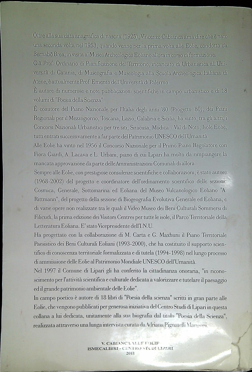 Pignatelli Mangoni, Adriana; Cabianca, Vincenzo Poesia della scienza : biografia sotto forma di intervista a V. Casabianca poeta della scienza. Bologna, ISMECA ; Lipari : Centro studi Lipari 2011, 565 p. ; 34 cm Strappo al piatto posteriore, con tracce di riparazione, comunque buon esemplare (74726)