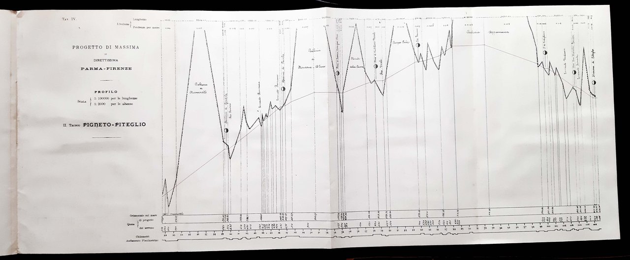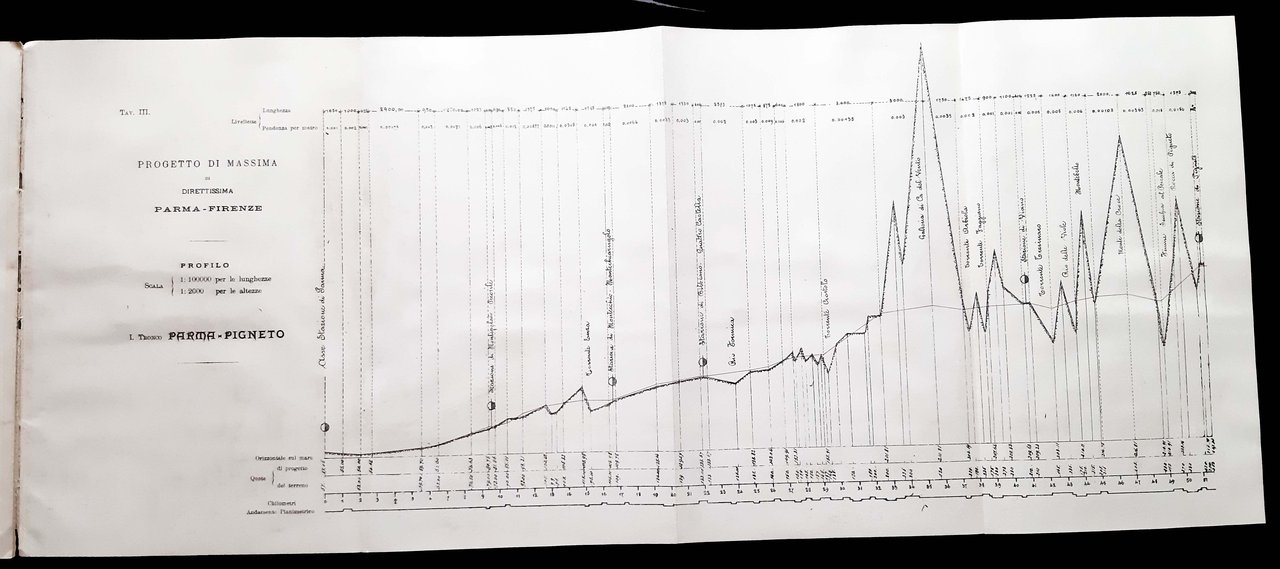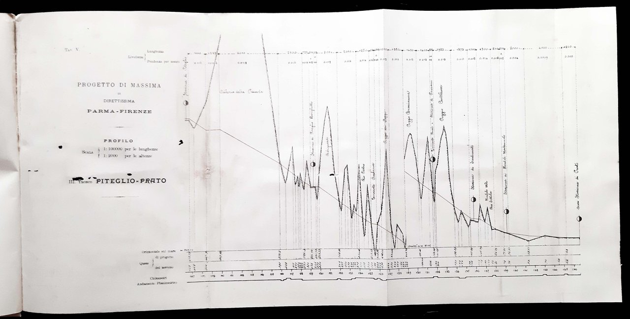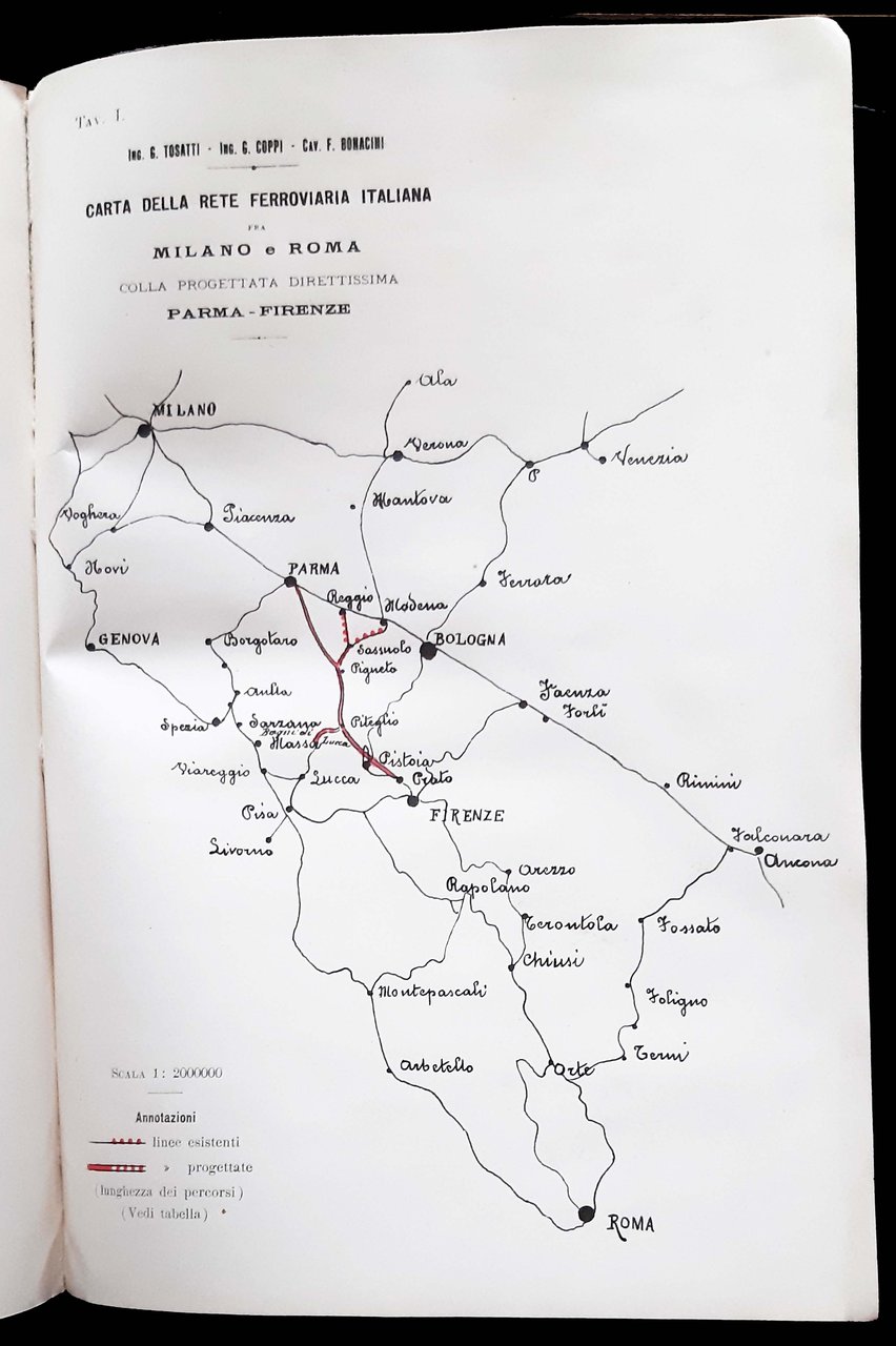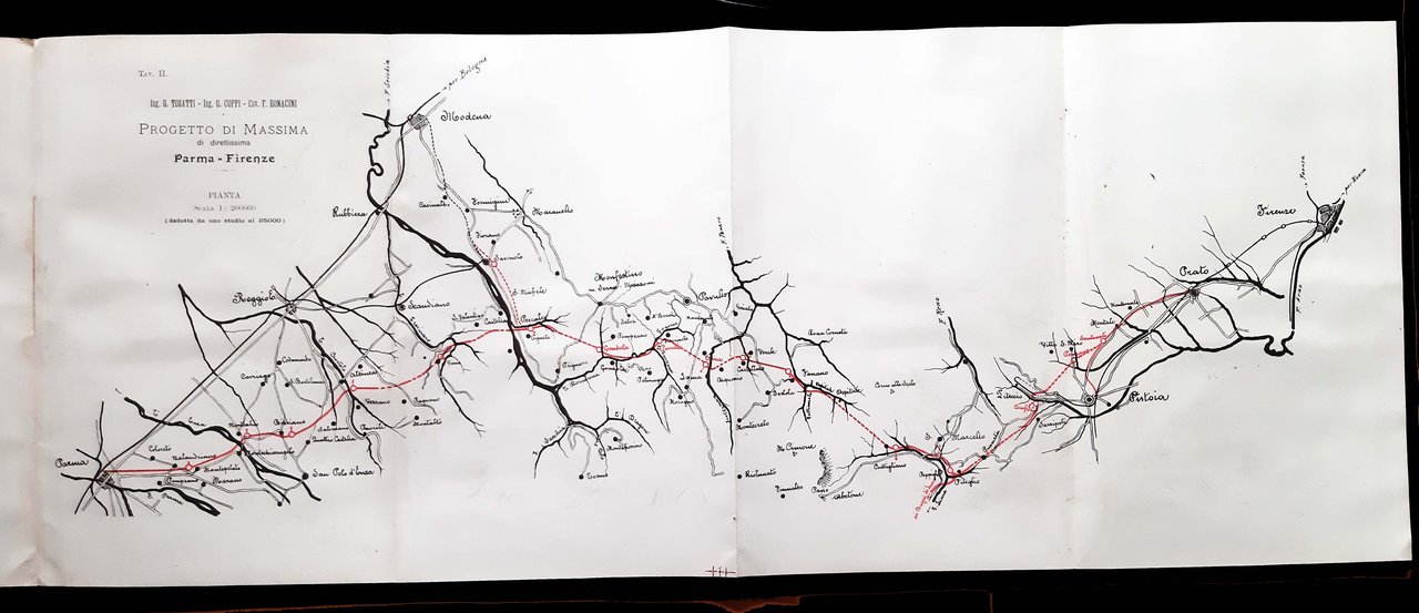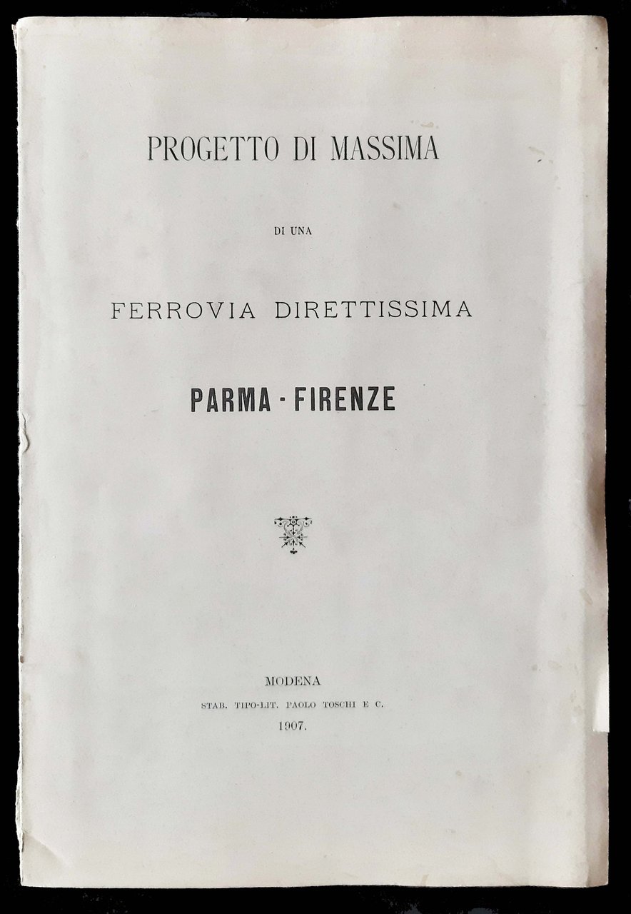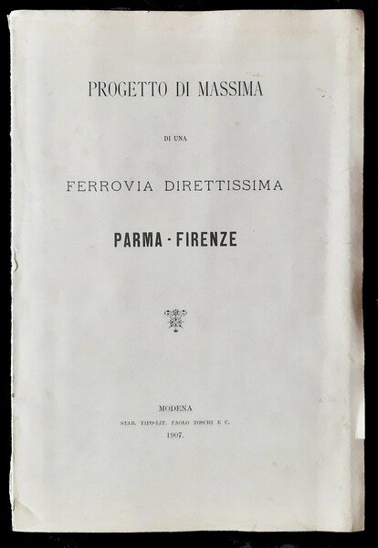 Un volume, dim. 30x20 cm, legato in brossura editoriale, con titolo in b/n sulla copertina e al frontespizio; pp. 12, [7] c. di tav. di cui 4 ripiegate (piante e profili) in nero e rosso. Presentazione dell'assessore ai lavori pubblici del comune di Parma, ing. Maffei del progetto degli ingegneri modenesi Tosatti-Coppi-Bonacini per una linea ferroviaria diretta fra Parma e Firenze. Rif.: IT\ICCU\CUB\0640252. OCLC, 1096428307. Cond.: Buone (presenza di alcune leggere macchie da aloni d'umido e abrasioni alla copertina posteriore).