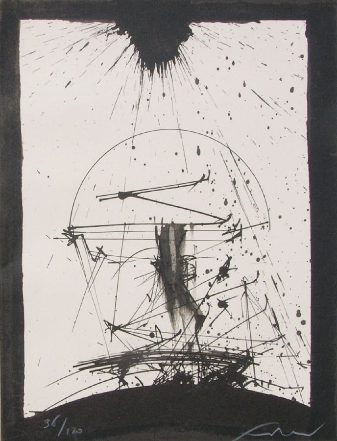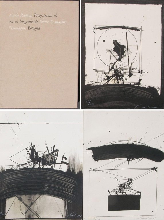 Poema di Mario Ramous e 6 litografie originali di Emilio Scanavino, numerate e firmate, sciolte in apposite cartellette cucite al volume (cm 30x23) Prima edizione di 135 esemplari. numerati, di cui 15 fuori commercio numerati con cifre romana destinati all'autore, all'artista e all'editore, 120 numerati con cifre arabe e alcune prove di stampa. Testo composto in caratteri Garamond dalle Arti grafiche Tamari di Bologna, stampato su carta Miliani Fabriano. Le litografie di Emilio Scanavino sono state tirate sui torchi bolognesi di Gaetano Orlandi. Legatura di Antonio Capitani di Bologna.