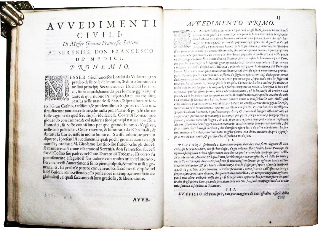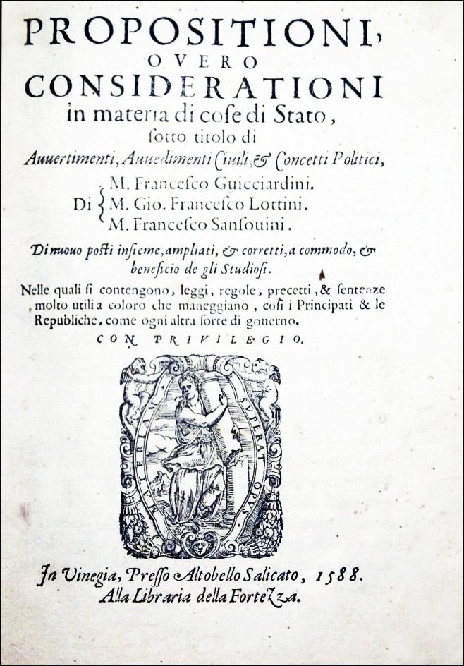 Propositioni, overo considerationi in materia di cose di Stato, sotto titolo di avvertimenti, avvedimenti civili et concetti politici di M. Francesco Guicciardini, M. Gio. Francesco Lottini, M. Francesco Sansovini. Di nuovo posti insieme, ampliati, et corretti, a commodo, et beneficio de gli studiosi. Nelle quali si contengono, leggi, regole, precetti, & sentenze molto utili a coloro che maneggiano, cosi i principati & le repubbliche, come ogni altra sorte di governo.