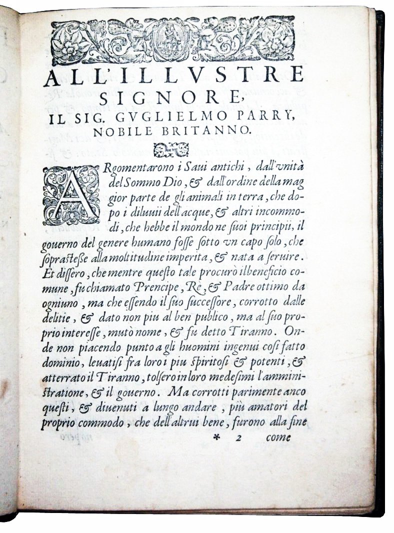 8vo (220x160 mm); XX century half green morocco with green percaline at boards, guilted title at five raised bands spine; modern marbled flyleaves; (8), 156 leaves; woodcut device at title-page, xylographic head-pieces, historiated woodcut initials and ornaments; xylographic Guicciardini's portrait in a figurated oval frame at front of the beginning of his Avvertimenti politici. Text in Italian, printed in italics. An interesting collection of three Guicciardini's political treaties, in its second edition (a reprint of the original, dated 1583). The volume contains the dedicatory letter to Sir William Parry (All'Illustre Signore, il Sig. Guglielmo Parry, nobile britanno), made in Venice on the 15th of April, 1583, by Francesco Sansovino; following on, the table of contents, then the Avvertimenti politici by Guicciardini, the Avvedimenti civili by Lottini and the Concetti politici by Sansovino. Francesco Guicciardini (1483-1540) was an Italian historian and statesman (diplomatic advisor both for the Papacy and for the Florentine Republic and the the Medici family). Francesco Tatti da Sansovino (1521-1586) was a versatile Italian scholar and man of letters, also known as a publisher. Giovanni Francesco (Giovanfrancesco) Lottini (1512-1572 ) was an Italian politician, writer and Catholic Bishop. Ref.: IT\ICCU\LIAE\000616. CNCE, 22331. OCLC, 69109919, 601012710 and 504726467 (UK, Netherlands, Switzerland). No copy of this edition in USA. Cond.: The last ten leaves a bit soiled at the inner upper corner; a very little wormhole at title-page not affecting the text. Good copy.
