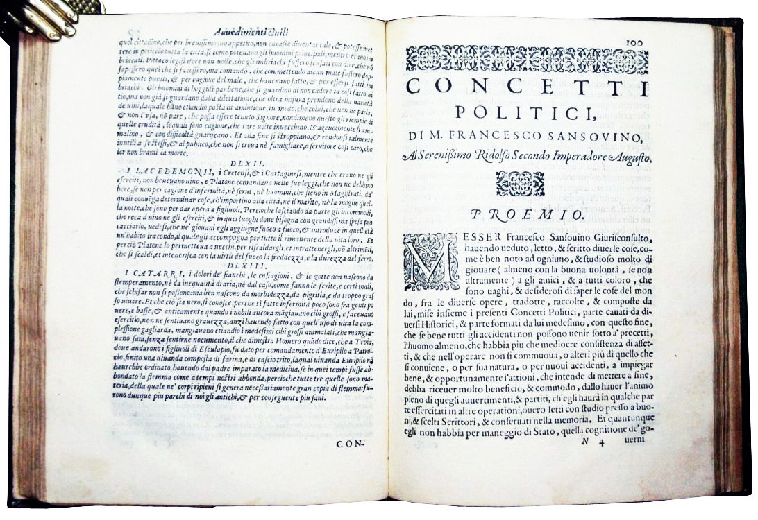 Propositioni, overo considerationi in materia di cose di Stato, sotto titolo di avvertimenti, avvedimenti civili et concetti politici di M. Francesco Guicciardini, M. Gio. Francesco Lottini, M. Francesco Sansovini. Di nuovo posti insieme, ampliati, et corretti, a commodo, et beneficio de gli studiosi. Nelle quali si contengono, leggi, regole, precetti, & sentenze molto utili a coloro che maneggiano, cosi i principati & le repubbliche, come ogni altra sorte di governo. | Libros antiguos y modernos | Guicciardini, Francesco - Lottini, Giovanni Francesco - Sansovin, O, Francesco