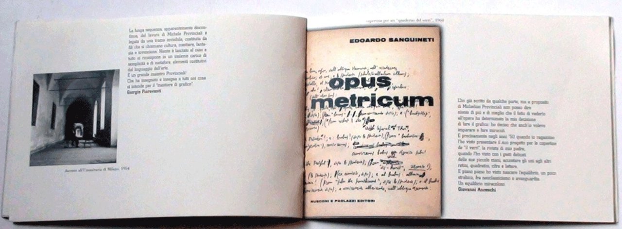 Catalogo di mostra presso la Galleria Aiap di Viale Col di Lana, 12 a Milano nel 1999. A cura di Mario Piazza. Nel catalogo sono presenti i contributi scritti di: AG Fronzoni, Massimo Dolcini, Gillo Dorfles, Mauro Panzeri, Giulio Castelli, Marcello Minale, Giovanni Baule, Alessio Leonardi, Dino Gavina, Massimo Casamenti, Massimo Vignelli, Bruno Alfieri, Aldo Colonetti, Pino Trogu, Gelsomino D'Ambrosio, Roberto Pieracini, Leonardo Sonnoli, Giorgio Fioravanti, Giovanni Anceschi, Giancarlo Iliprandi, Heinz Waibl, Marco Tortoioli Ricci, Italo Lupi, Vittorio Gregotti. Illustrazioni a colori . Cm 16x24. pp. 32. . Ottimo (Fine). . . . “Per conoscere l'immenso tappeto di invenzioni sul progetto di Michele Provinciali bisogna procedere per gradi, attraversio un lavoro di avvicinamento e di fascinazione. Antipasti e l'artefatto della mostra ‘Provinciali,. Antipasti è una anticipazione, ma non è un semplice assaggio. È una scoperta perché come nella grammatica della buona tavola, antipasti misura il valore del pranzo, è il riassunto delle delizie, è il mettere in mostra l'essenza del sapere del cuoco. È scoprire la sua conoscenza, la sua esperienza, la sua esperienza, i suoi segreti nella forma di epigrammi, di volute barocche, di petali inebrianti. È inoltre e la bellezza, la calma e la voluttà. Antipasti è l'incanto che Provinciali ha preparato per voi.”