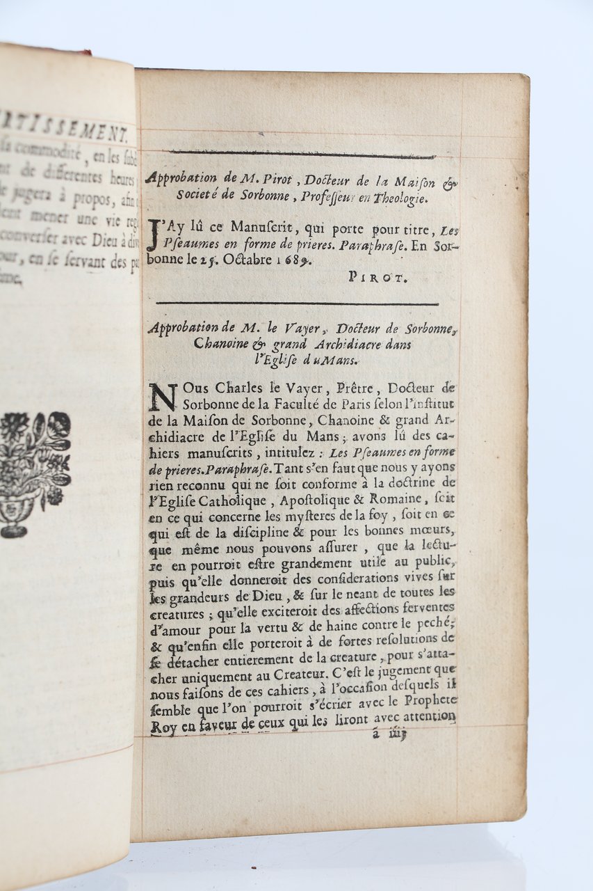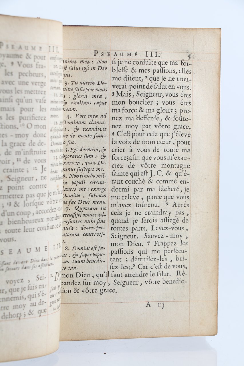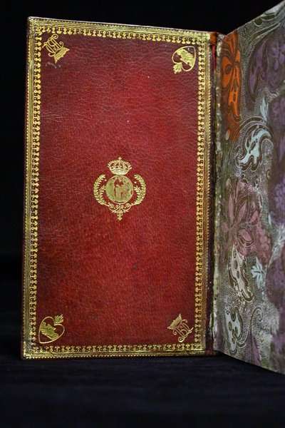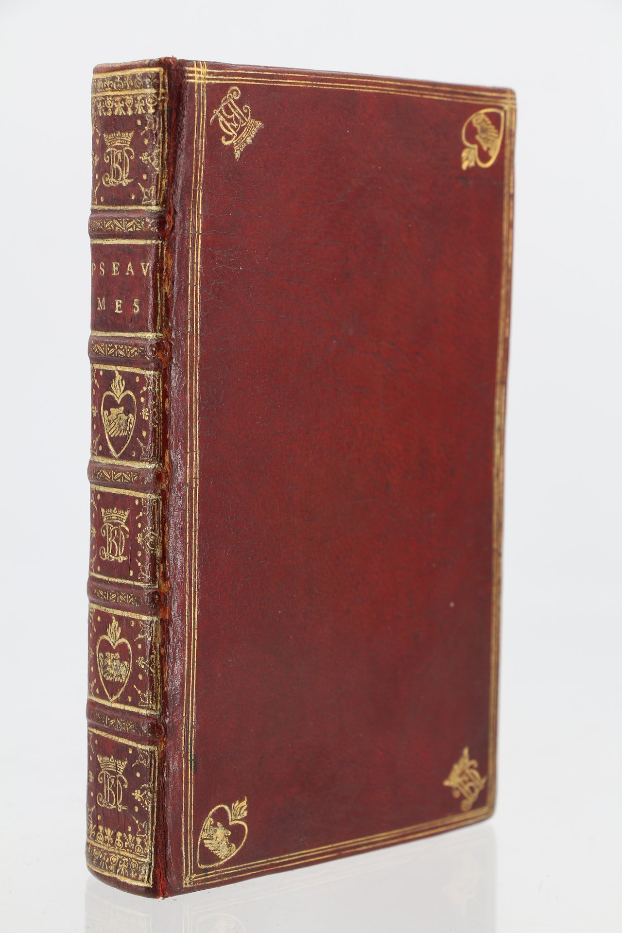Chez Daniel Horthemels | à Paris 1690 | 10 x 17 cm | relié | First edition. A ruled copy. French translation of Latin text on same page. This copy bears unidentified initials. Contemporary lined red morocco, spine in compartments with two tools, crowned initials BD and a third letter (most likely a ‘T') and two hands shaking hands inside a heart (the arms of the town of Sées in Normandy); these tools repeated on the corners of the covers (with a triple fillet frame). The morocco lining also has these tools in the corners, with a personalized central tool consisting of a crowned medallion with an angel facing a kneeling figure preparing to receive the Holy Spirit. Gilt edges. Slightly rubbed along joints. A fine copy in the rarest of conditions. * [FRENCH VERSION FOLLOWS] | Edition originale. Exemplaire réglé. Traduction en français en regard du texte latin, sur la même page. Exemplaire au chiffre non identifié. Reliure en plein maroquin rouge doublé d'époque. Dos à nerfs orné de deux fers, le chiffre couronné BD et une troisième lettre (sans doute un T) et deux mains se serrant à l'intérieur d'un coeur (armes de la ville de Sées en Normandie) ; fers que l'on retrouve aux écoinçons sur les plats (avec triple filet d'encadrement). La doublure de maroquin reporte également ces fers angulaires avec un fer personnalisé central figurant sous une couronne en médaillon un ange face à un personnage agenouillé prêt à recevoir l'Esprit saint. Tranches dorées. Légers frottements le long des nerfs. Très bel exemplaire, dans une condition des plus rares.
