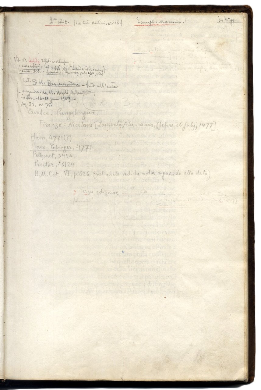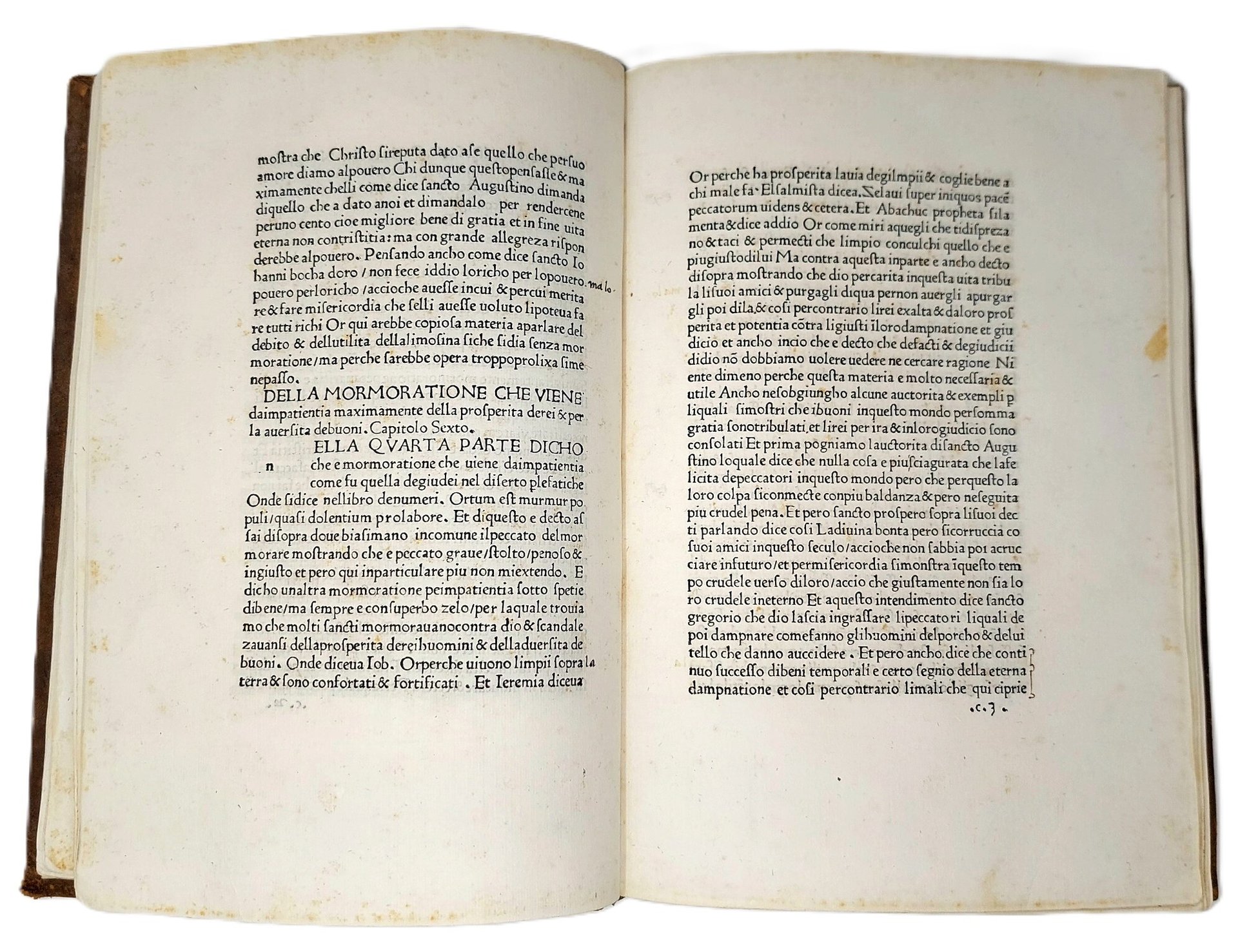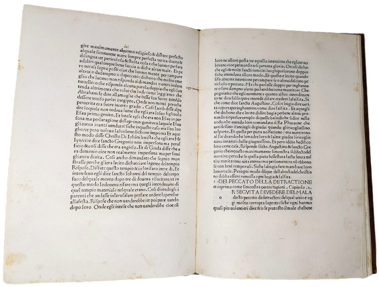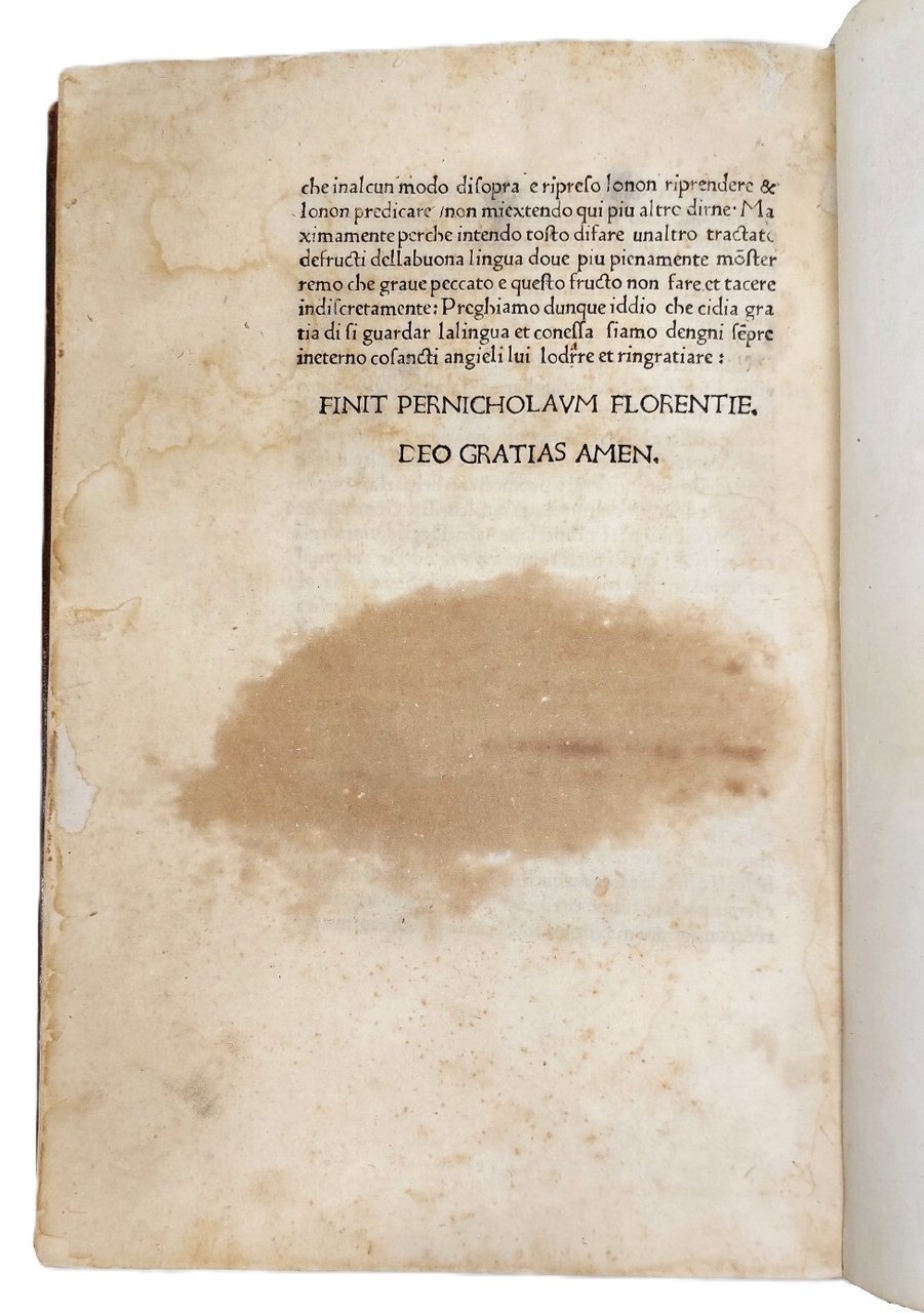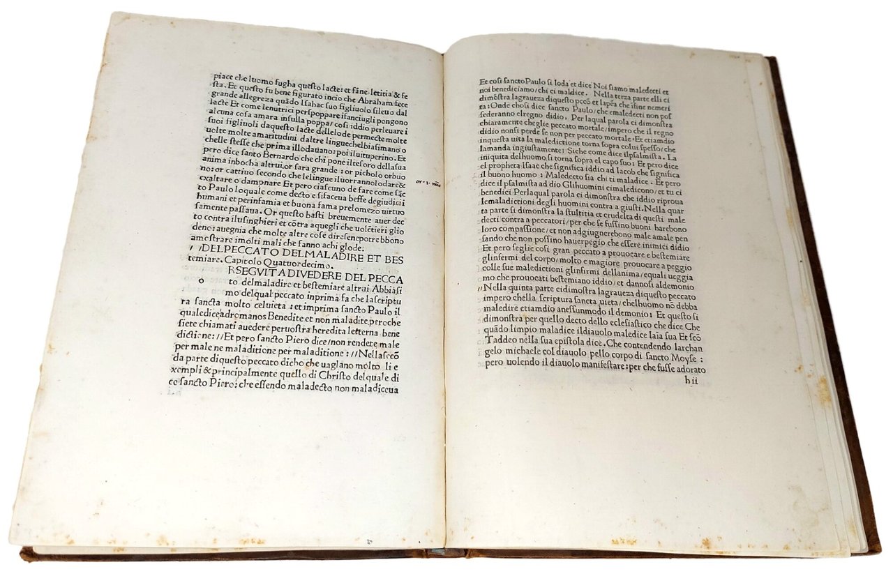 >in-4 (284x185 mm), 117 ff. (su 118, ultimo bianco mancante), carattere romano, legatura in pelle del XIX secolo, cornice oro con fiori e drappeggio ai piatti, dorso con titolo e ricchi motivi vegetali sempre in oro. Rara terza edizione (dopo Roma 1472 e Milano 1475) della più vivace delle operette cavalchiane, la più ricca di aneddoti esemplari, miracoli, di proverbi e di altri materiali folclorici. Il trattato vuol mettere in guardia dai vizi che nascono dal cattivo uso della lingua. Precedono alcune considerazioni sulla nobiltà e l'utilità del linguaggio (quasi un abbozzo dei Frutti della Lingua), poi si passano ordinatamente in rassegna i peccati che l'uomo commette parlando (la bestemmia, la moralizzazione, lo spergiuro, la menzogna...). I bersagli più insistentemente colpiti sono i giullari, le mezzane disposte, le donne fatue, gli incantatori, i negromanti. In Cavalca, come in tutti i maggiori predicatori domenicani del primo Trecento, vi è una vivissima preoccupazione per il diffondersi di nuovi movimenti ereticali, in particolare quello degli "apostoli", seguaci di Gherardo Segarelli. Esemplare con margini molto ampi (macchia d'umido all'ultimo foglio con piccoli restauri al margine, lievi fioriture ai primissimi ff.). Di illustre provenienza: appartenuto al celebre libraio e collezionista Giuseppe Martini, con sue note manoscritte nel suo inconfondibile stile calligrafico, a lapis e con sottolineature in rosso e blu, alle sguardie anteriori. Martini (1870-1944), attivo a Lucca, New York e Lugano nei primi decenni del Novecento, ebbe il merito di diffondere l'erudizione e la bellezza, oltre a venderle, attraverso i magnifici libri che trattava. Come in questo caso, era solito apporre le indicazioni bibliografiche a lapis sui fogli di risguardo oppure applicare sul contropiatto la scheda a penna su cartoncini. I grassetti o i corsivi evidenziati a matita rossa o blu, per indicare al compositore il carattere da utilizzare per il catalogo. Inoltre, ex libris di Olschki, Colombi, minute annotazioni ms. coeve. Gamba 308. BMC VI, 626. DBIt XII, 577-586. Goff C 338. IGI 2633. CATALOGO MARTINI 115.