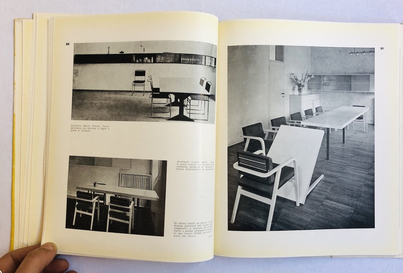 Il volume è suddiviso nelle seguenti sezioni: Tavoli con struttura metallica, Tavoli con struttura in legno e piani in materiali diversi, Tavoli a caratteristiche particolari, Tavoli per diversi usi, Tavolini, Tavolini porta telefono, Piani d'appoggio, Leggii, Carrelli, Toelette. All'interno modelli di: Marcel Breuer, Paolo Chessa, Richard Stein, Augusto Magnaghi, Werner Moser e molti altri. Ampiamente illustrato con fotografie in bianco e nero. Indice degli autori e bibliografia . 8vo (23x19 cm). pp. 148. . Molto buono (Very Good). Sovracoperta sciupata ai margini con strappetti e mancanze (Some chipping and nicks around top and bottom of dust jacket). Prima edizione (First Edition). .