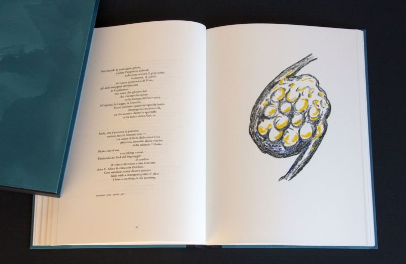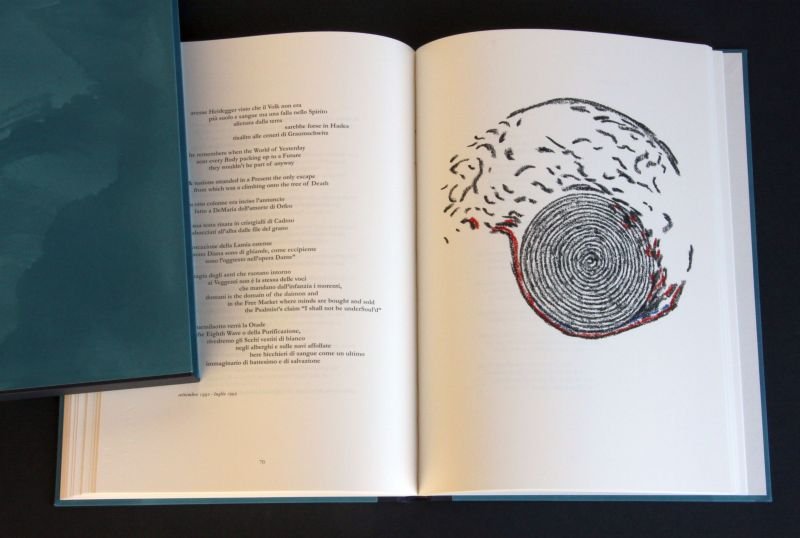 Libro d'artista composto da 12 testi poetici inediti di Mario Diacono e 12 tavole originali di Piero Varroni realizzate con pastelli ad olio Stampato su carta Arches da 185 gr. Copertina e cofanetto dipinti a mano da Piero Varroni. 4to (cm 36x26). . . Perfetto (Mint). . Edizione originale di 12+3 es. numerati e firmati. .
