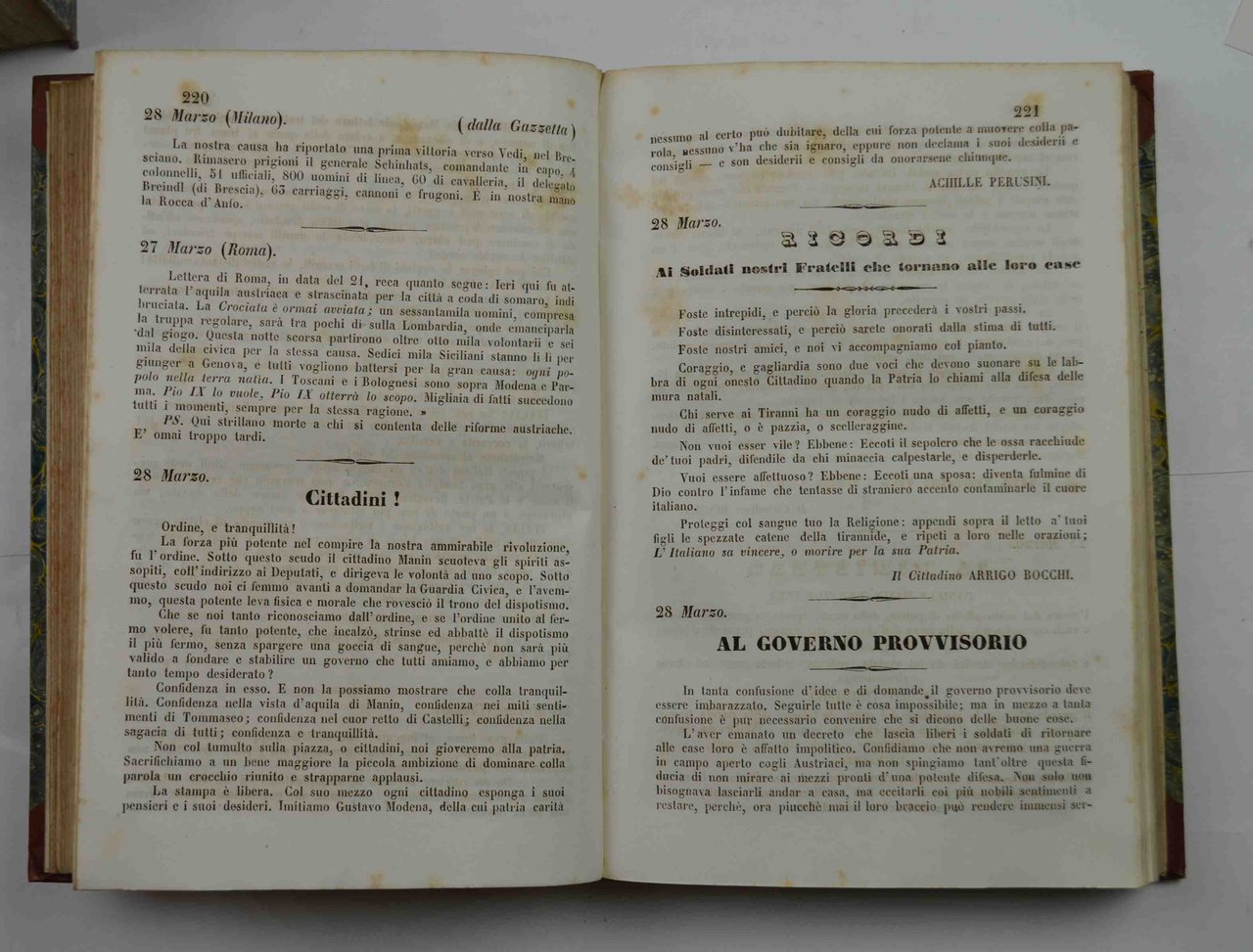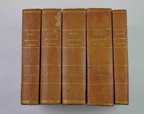 Otto tomi legati in cinque volumi di cm. 23,5, pp. 796; 515 (1); 466; 565; 635 (1); 600; 582; 486. Legatura coeva in mezza pelle con punte, dorsi lisci con filetti e titoli in oro. Qualche fioritura sparsa, peraltro esemplare genuino e ben conservato. Copiosa fonte di notizie storiche riguardanti il periodo principale del primo Risorgimento italiano. Non comune e molto interessante per la comprensione degli avvenimenti politici e storici del tempo.