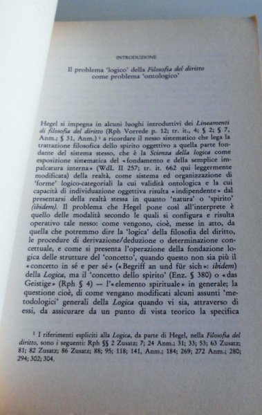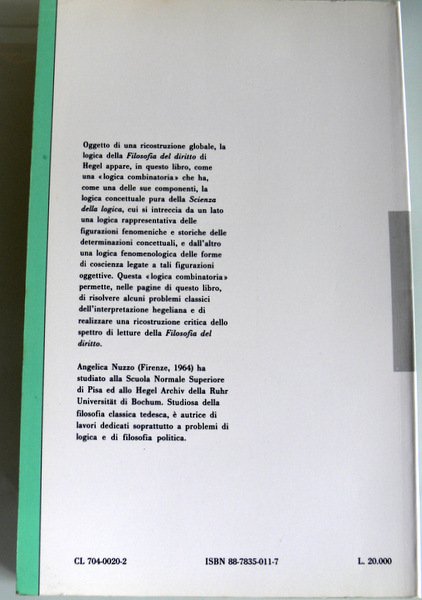 Soggetti: Filosofia del diritto, Ontologia, Saggistica, Ideologia tedesca, Germania, Logica, Fenomenologia dello spirito, Tempo, Morale, Etica, Critica hegeliana, Interpretazione, Problemi logici, Politica, Opere generali, Studi critici, Bibliografia, Libri Vintage Fuori catalogo, Studi culturali, Logos, Verità, Pensiero concettuale, Concezione hegeliana della metafisica, Prefazioni, Jena, Spinoza, Scienza razionale, Dottrina dell'essere, Razionalità, Kant, Logik der Philosophie, Spirito assoluto, Idea, Stato, Socializzazione, Werke, Suhrkamp Theorie Werk-ausgabe, Wissenschaft der Logik, Grundlinien der Philosophie des Rechts, Grundrisse, Lineamenti, Natura, Begriff, das Geistige, Siep, Wolff, Theunissen, Metafisica, Giudizio, Critique of Judgment, Costituzione, Memory, History, Justice, Giustizia, Hans Friedrich Fulda, Droit, Claudio Cesa, Rolf-Peter Horstmann, Elements of the Philosophy of Right, Determinazione, Encyclopedia, Essenza, Società civile, Contratto sociale, Religione, Idealismo tedesco, Giusnaturalismo, Scritti giovanili, Governo, Soggettività, Rappresentanza, Moralità, Fichte, Georg Wilhelm Friedrich Hegel, Problemi interpretativi, Studi hegeliani, Momento negativo, Superamento/conservazione, Aufhebung, Dialettica, Berlino, Jena, Objektives Denken, Oggettivo, Volontà, Eticità, Spirito Assoluto, Individuo, Massa, Sovranità, Guerra preventiva, Monarchia costituzionale, Scritti berlinesi, Solger, Humboldt, Dilthey, Lezioni, Philosophy of law, Ontology, Non-fiction, German Ideology, Germany, Logic, Phenomenology of the spirit, Time, Moral, Ethics, Hegelian criticism, Interpretation, Logical problems, Politics, General works, Critical studies, Bibliography, Out of print books, Cultural studies, Truth, Conceptual thinking, Hegelian conception of metaphysics, Forewords, Rational science, Doctrine of being, Rationality, Absolute spirit, State, Socialization, Outlines, Nature, Metaphysics, Judgment, Constitution, Determination, Essence, Civil society, Social contract, Religion, German idealism, Natural law, Early writings, Government, Subjectivity, Overcoming, Representation, Morality, Interpretative problems, Hegelian studies, Negative moment