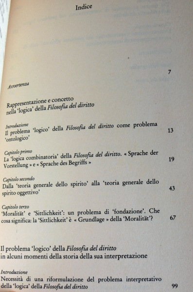 Oggetto di una ricostruzione globale, la logica della Filosofia del diritto di Hegel appare, in questo libro, come una «logica combinatoria» che ha, come una delle sue componenti la logica concettuale pura della Scienza della logica, cui si intreccia da un lato una logica rappresentativa delle figurazioni fenomeniche e storiche delle determinazioni concettuali, e dall'altro una logica fenomenologica delle forme di coscienza legate a tali figurazioni oggettive. Questa «logica combinatoria» permette, nelle pagine di questo libro, di risolvere alcuni problemi classici dell'interpretazione hegeliana e di realizzare una ricostruzione critica dello spettro di letture della Filosofia del diritto.